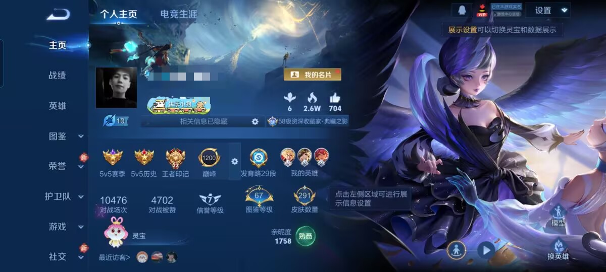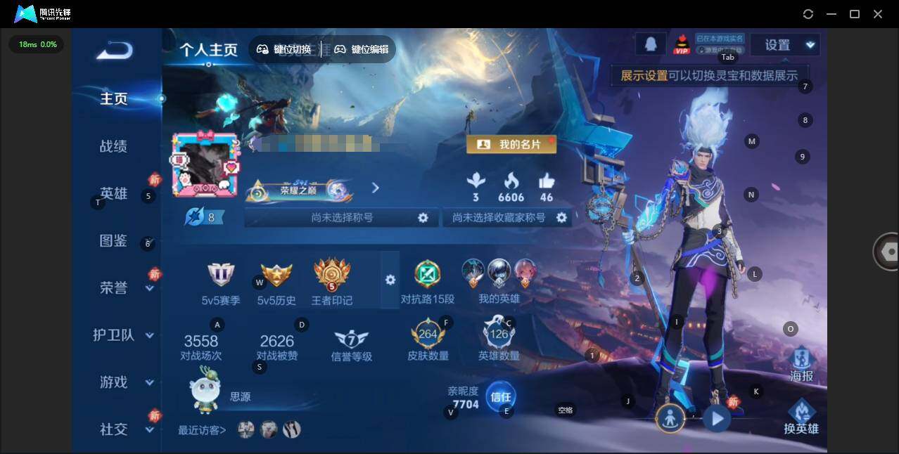 实名: 可修改 贵族等级: V8 英雄数: 126 皮肤数: 264 荣耀水晶