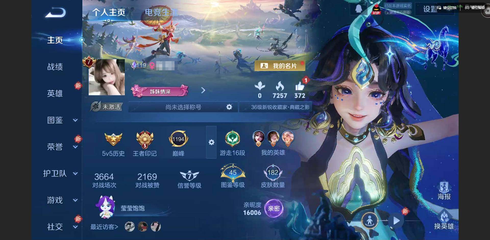 【女号】贵族等级: V7 英雄数: 126 皮肤数: 182 荣耀水晶: 拾光