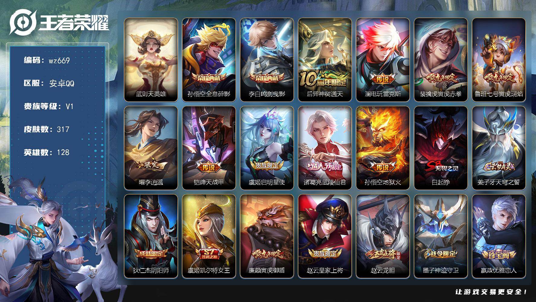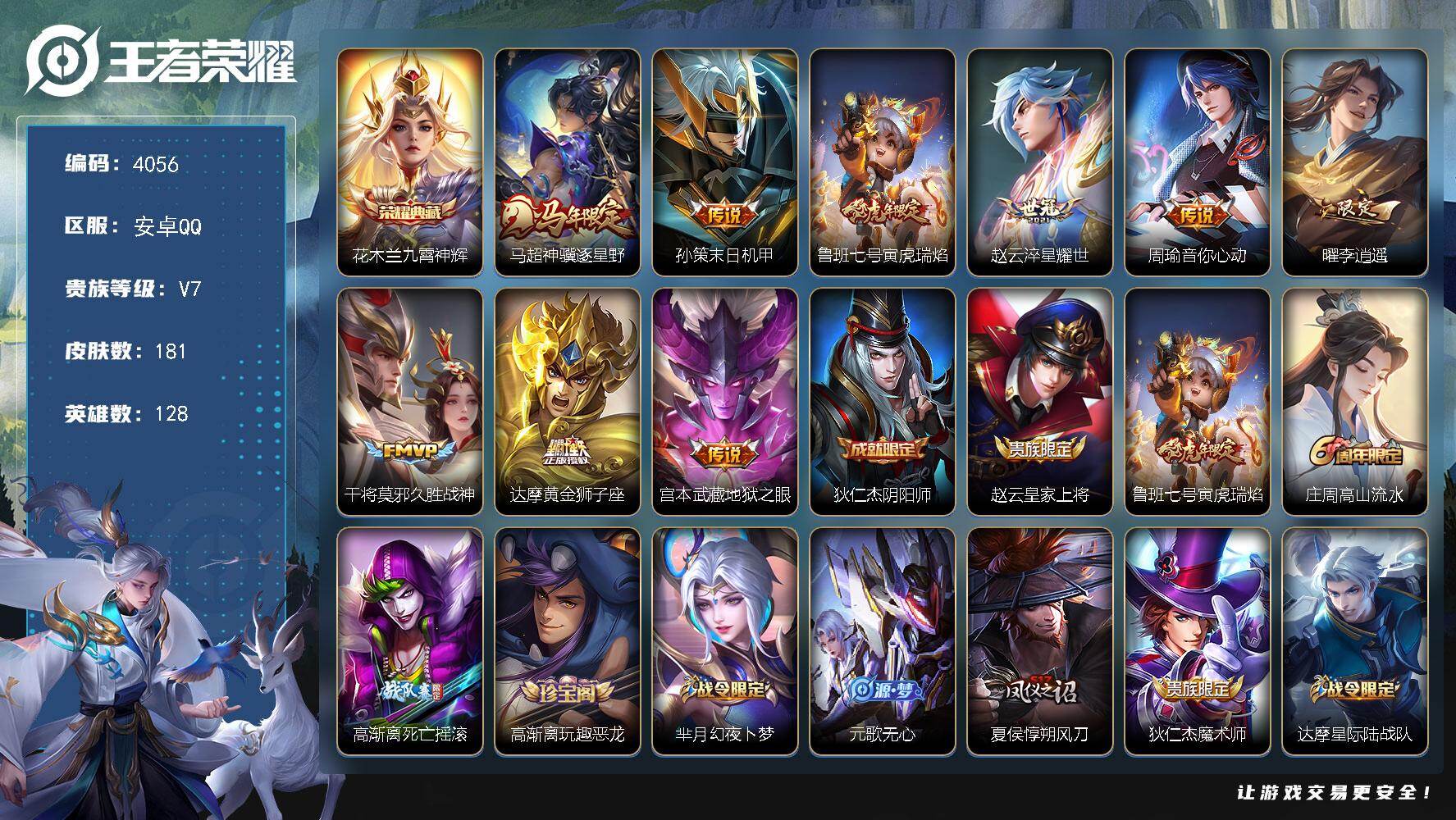 【1珍品21传说262皮肤1典藏1星元 秒换绑不用等】安卓Q-128英雄【1水