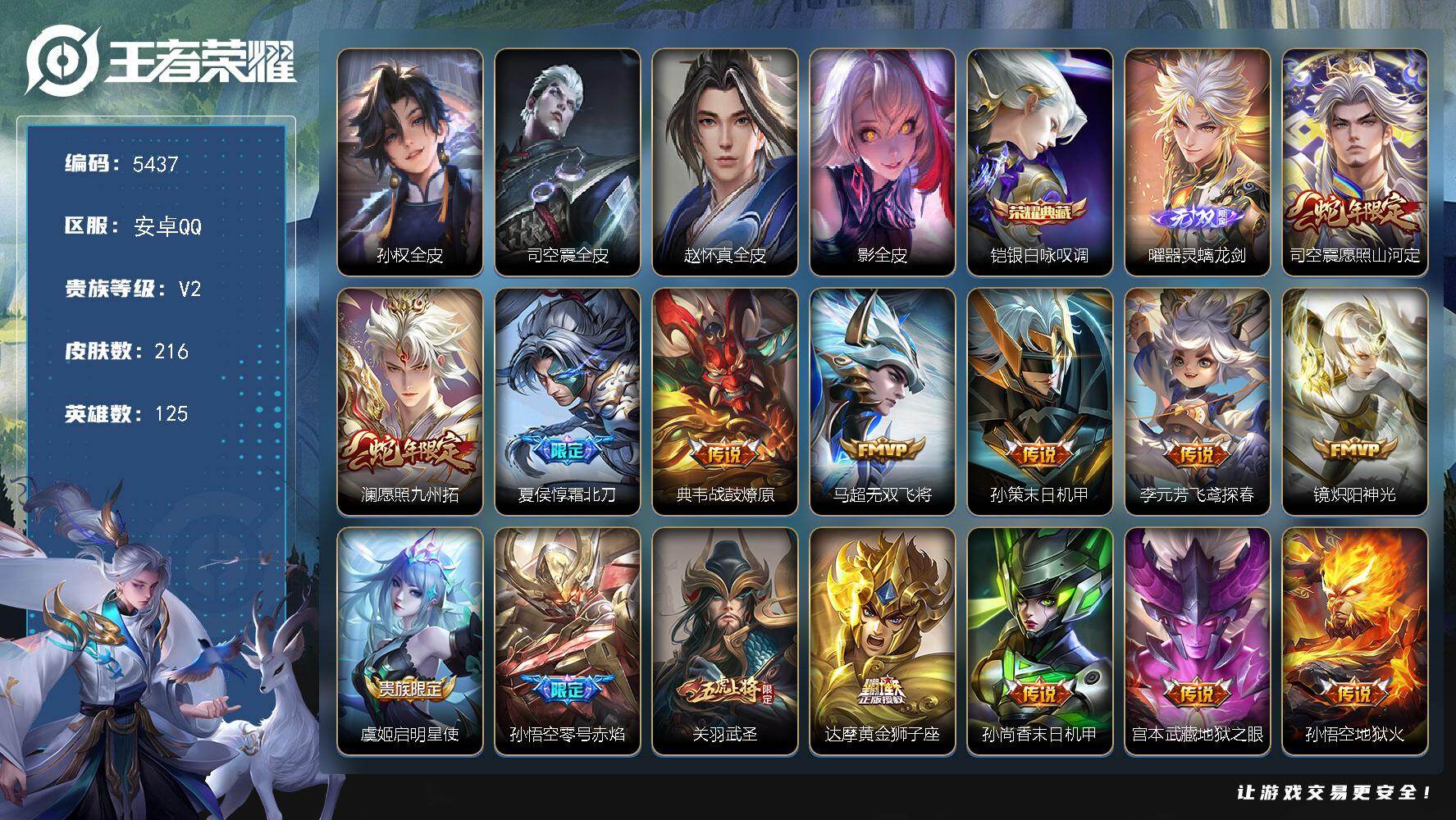 贵族8-贵族积分58352-216皮1典藏15传说1无双-4个英雄全皮 安