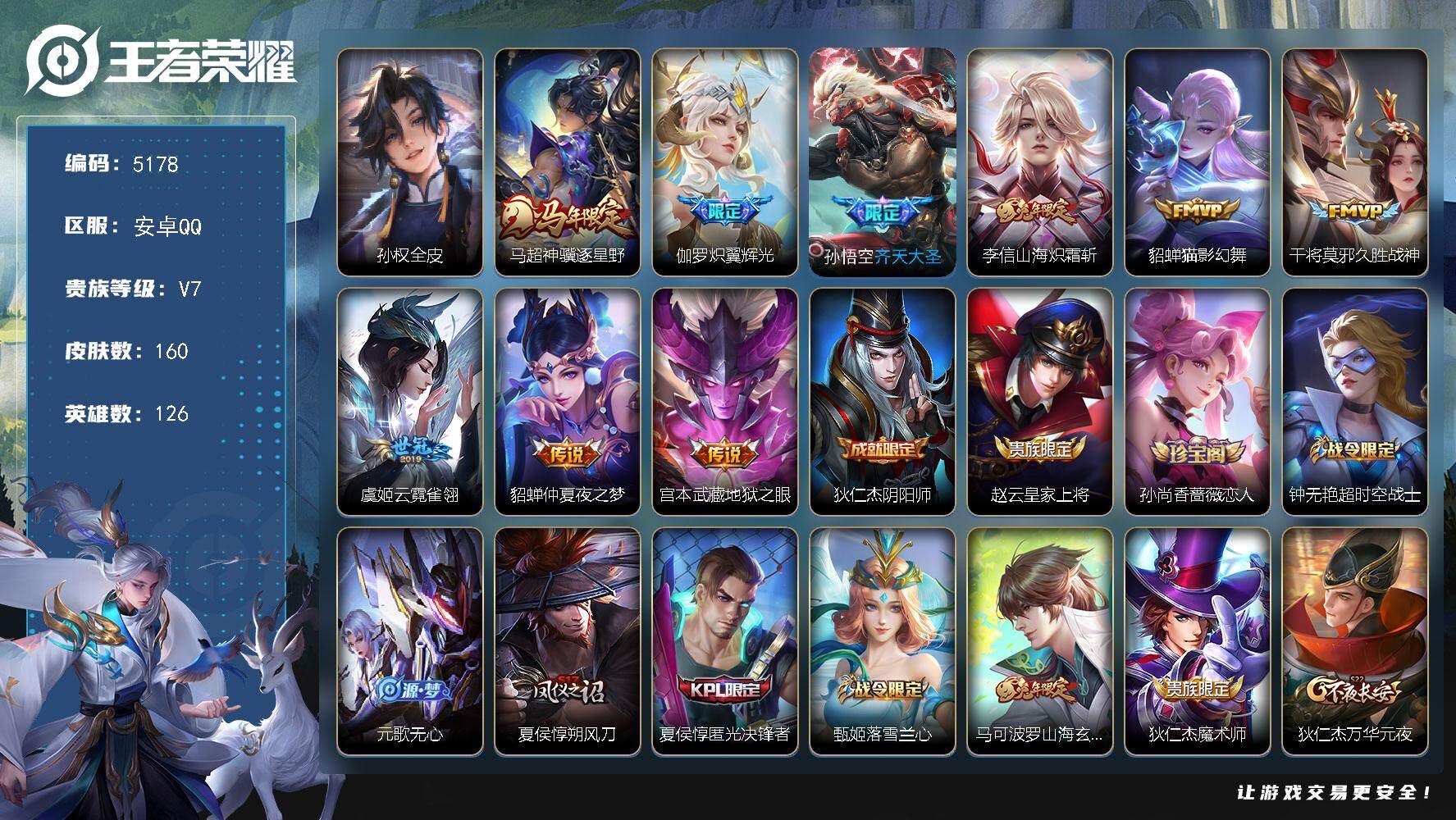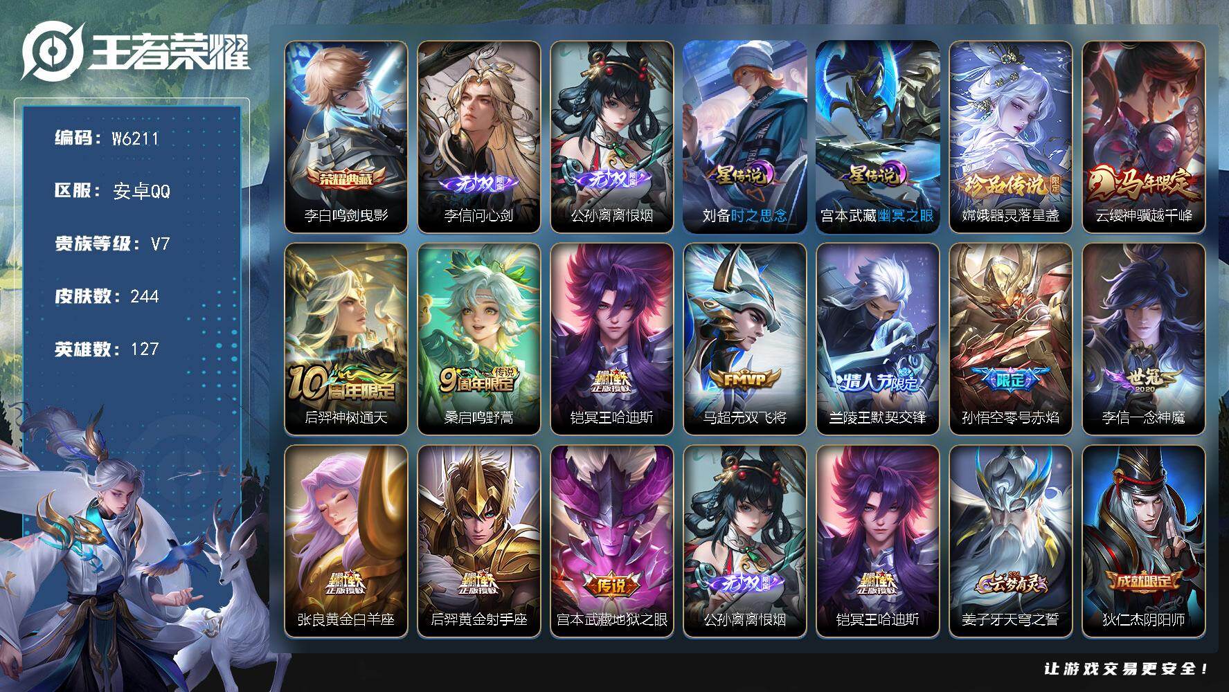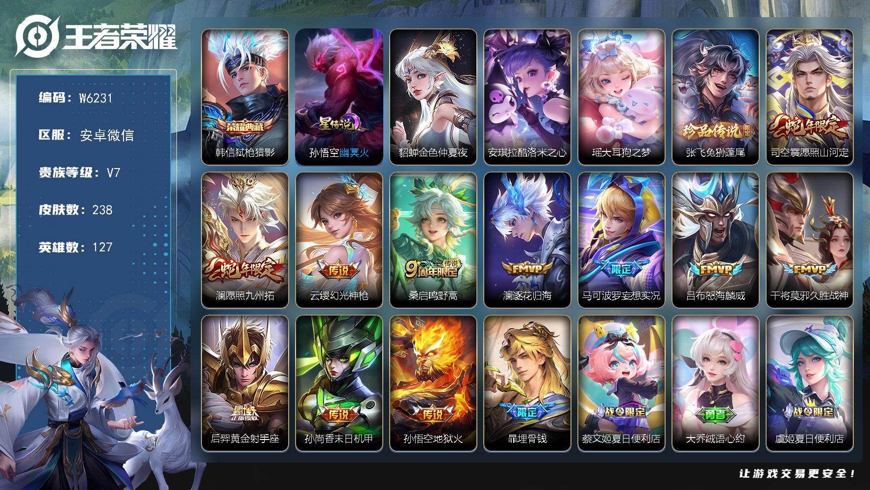 【W6292】安卓Q区-可二次-贵7-127英雄-230皮肤-1典藏-7传说-