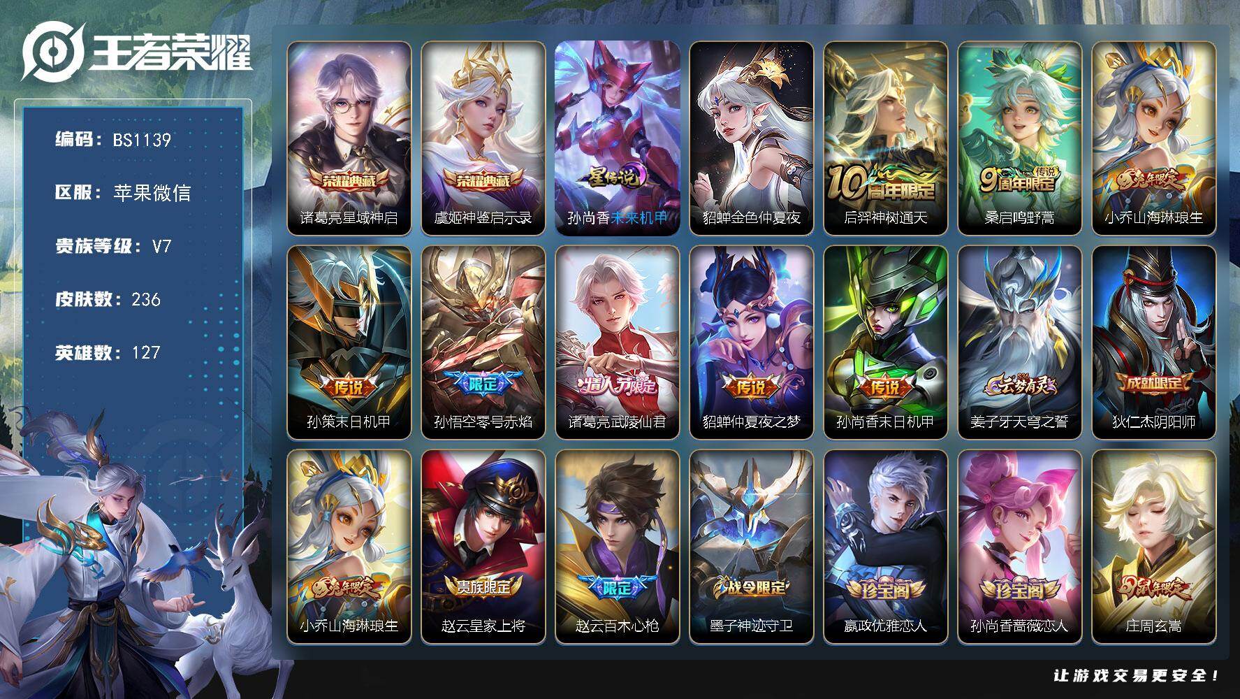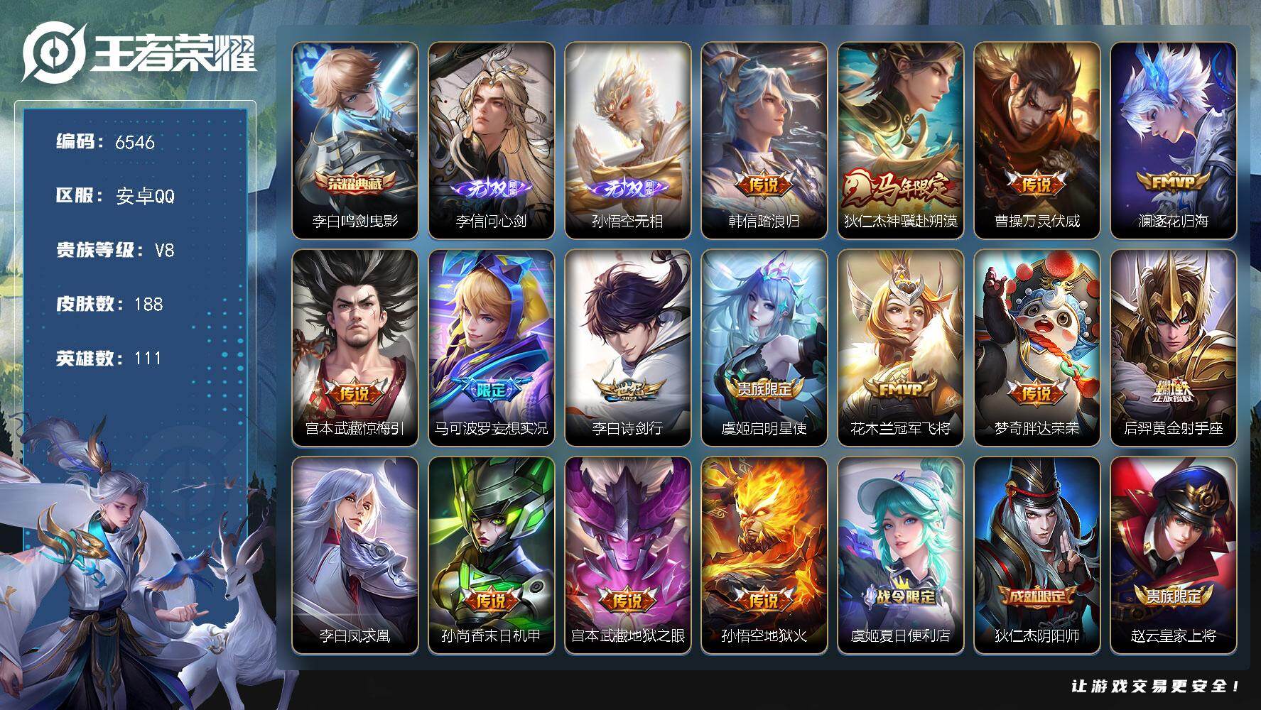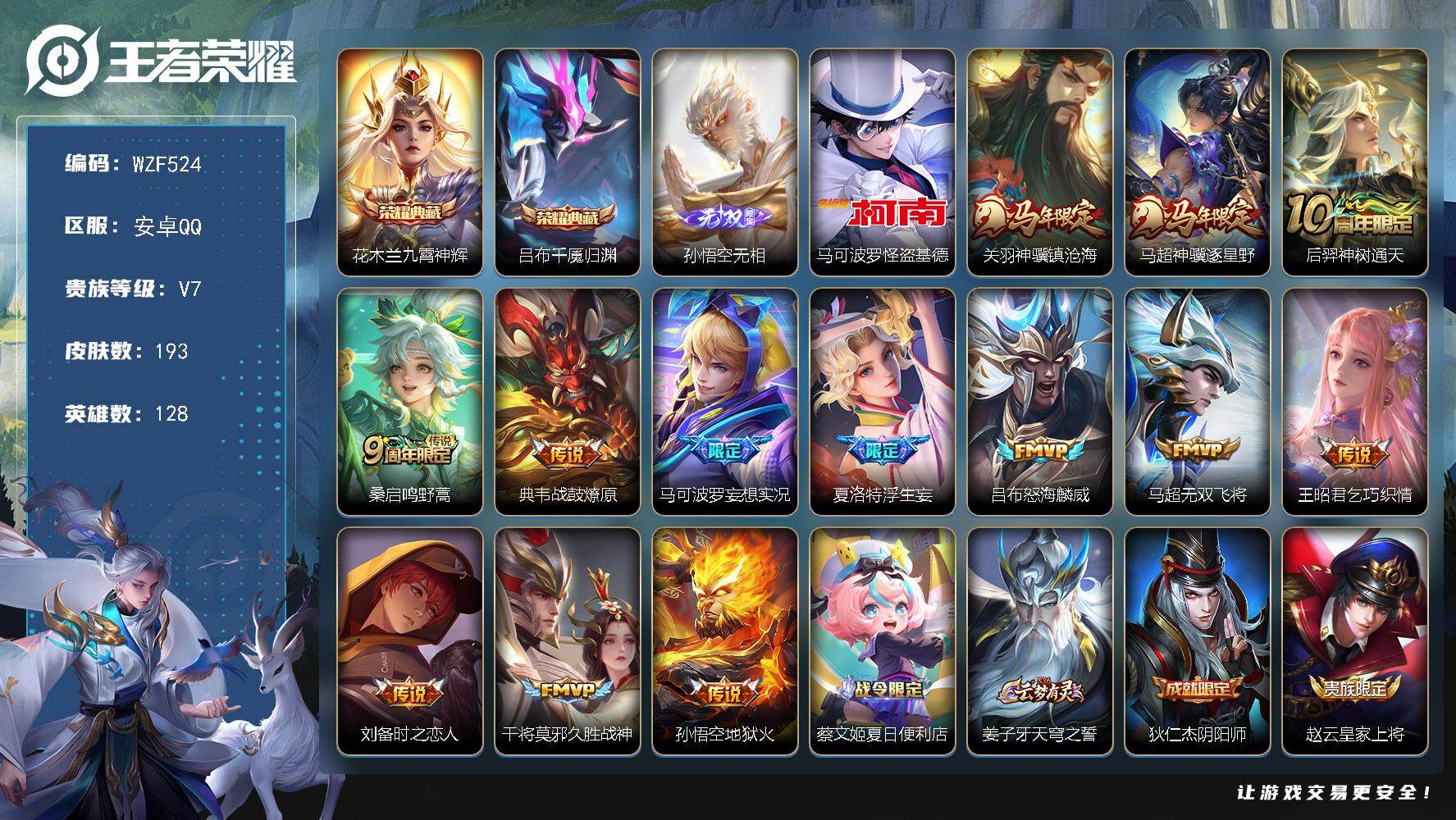 【W6292】安卓Q区-可二次-贵7-127英雄-230皮肤-1典藏-7传说-
