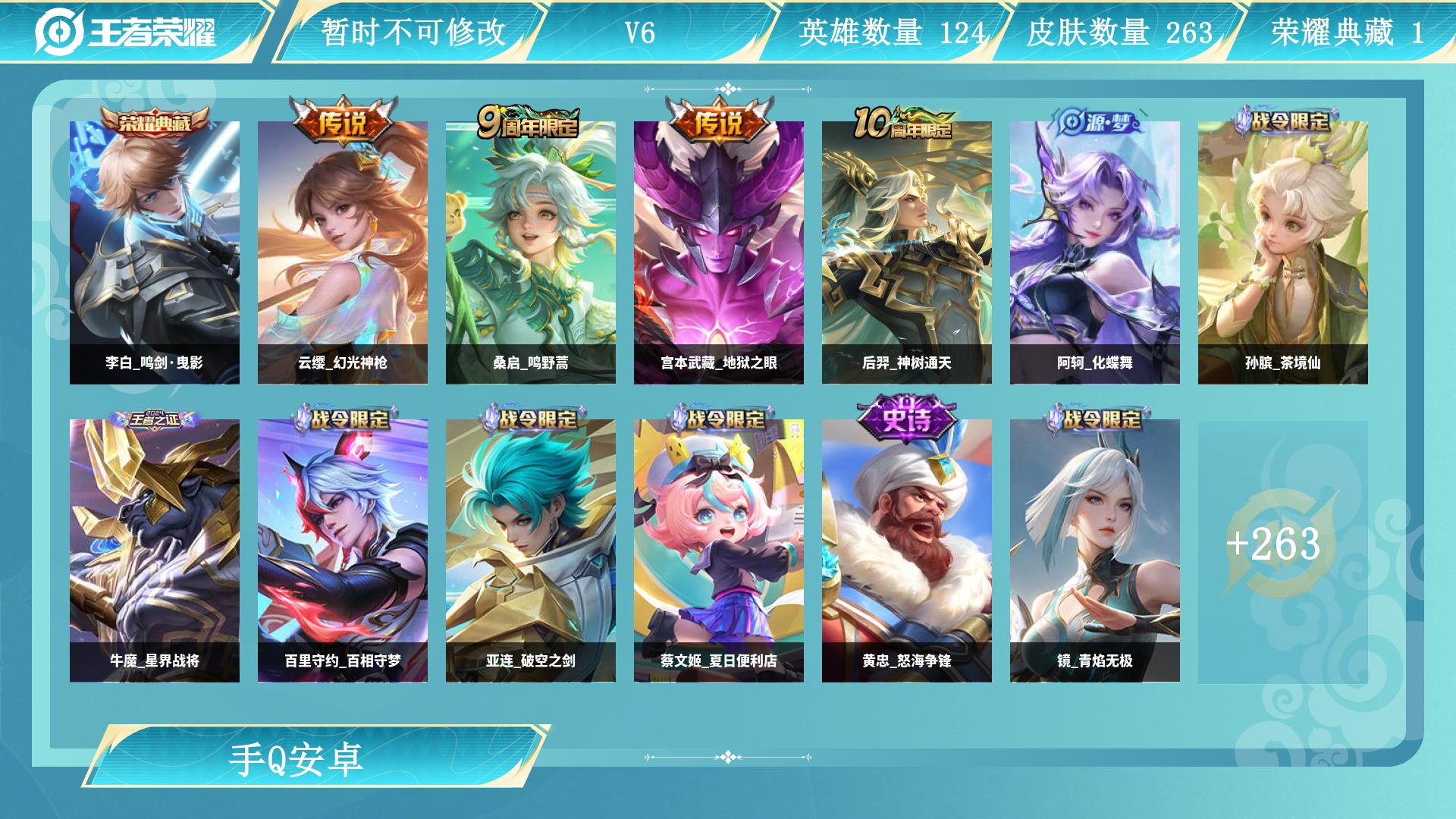 李白典藏+街头韩信皮肤数量263印记总数13V6无双王者暂时