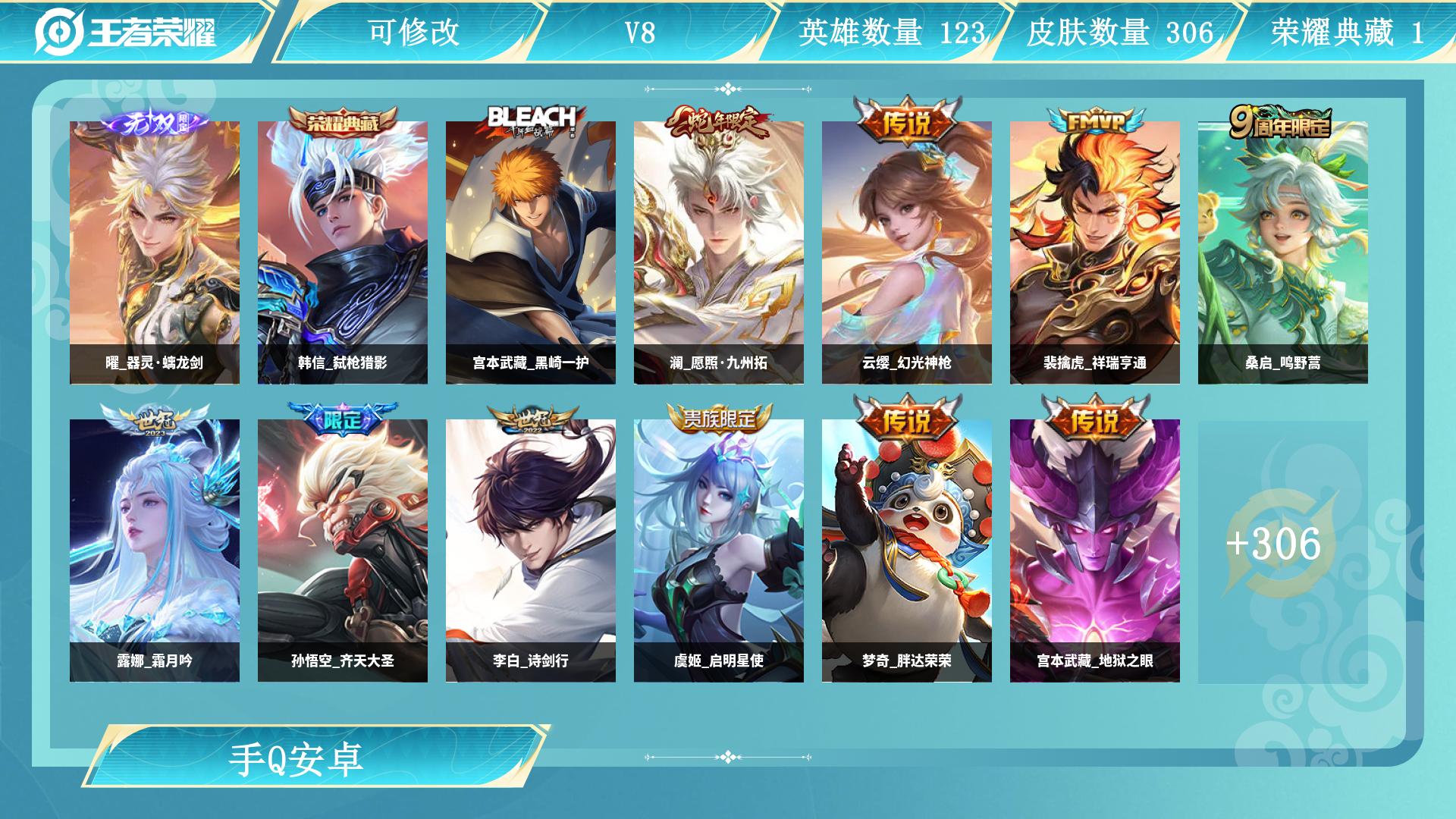 李白无双/瑶+韩信典藏/皮肤数量293印记总数19V8非凡王