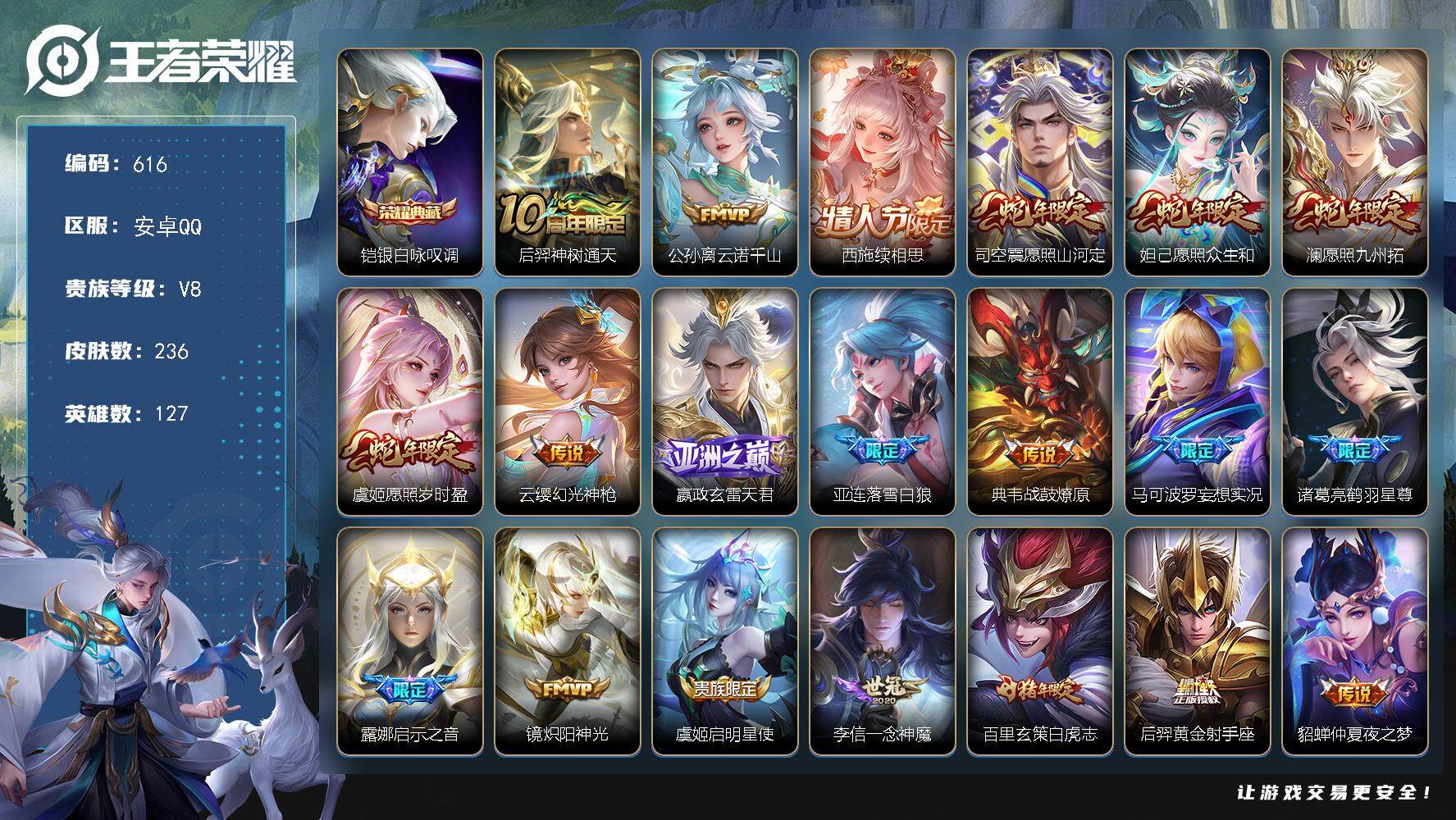 1825214 王者荣耀账号 安卓Q-V8-最强王者段位-127英雄-236皮