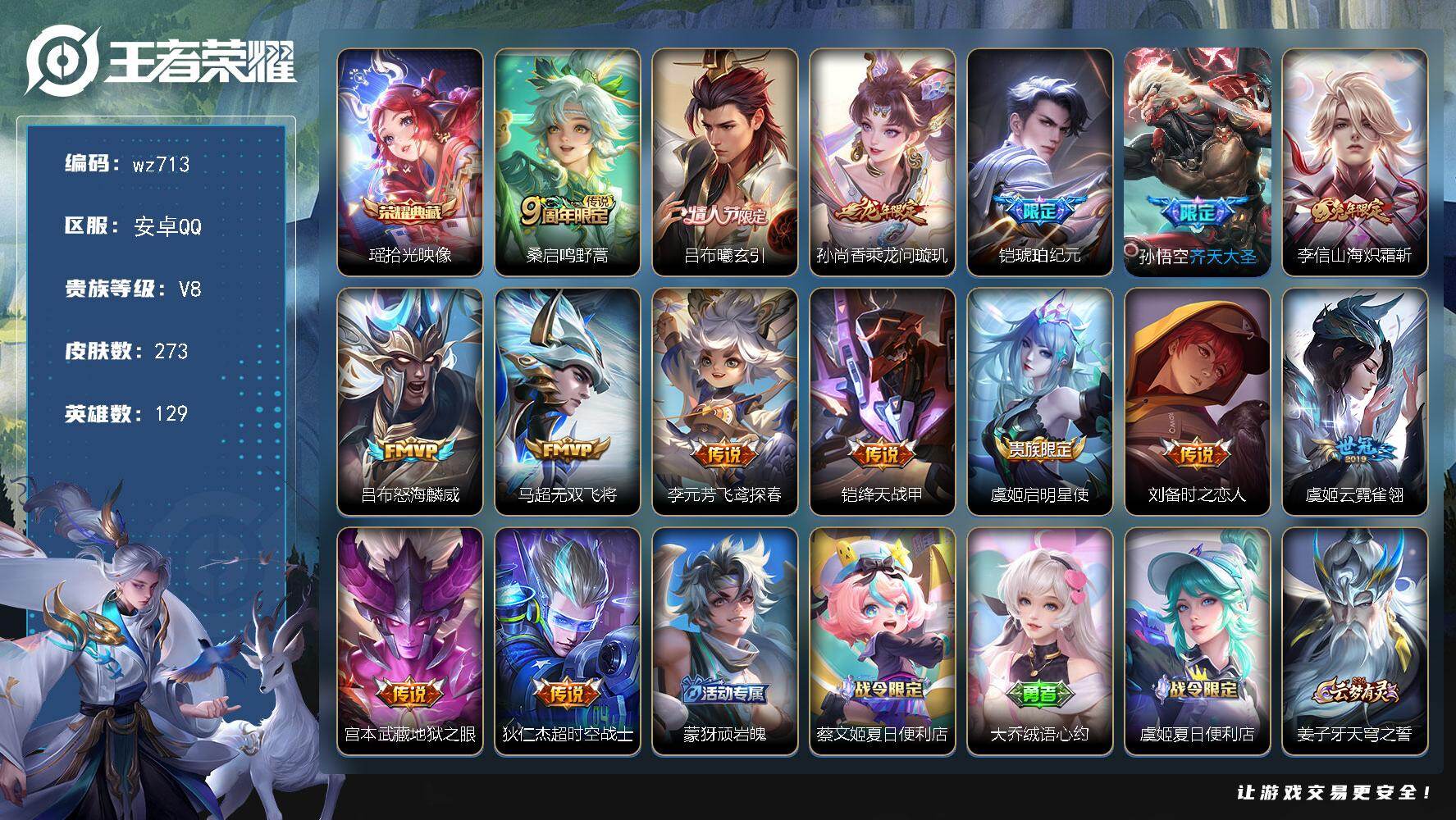 安卓Q-V8-至尊星耀I段位-129英雄-273皮肤-1典藏皮肤-15传说-8