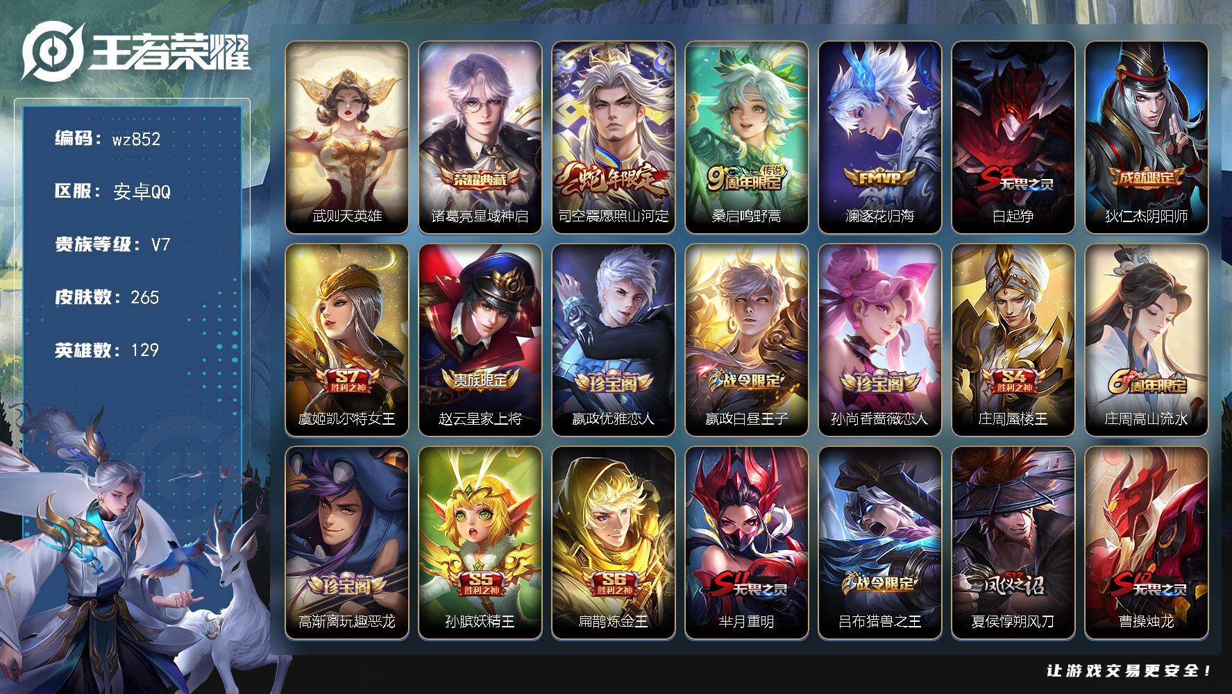 安卓Q-V7-至尊星耀V段位-129英雄-265皮肤-1典藏皮肤-1典藏英雄-