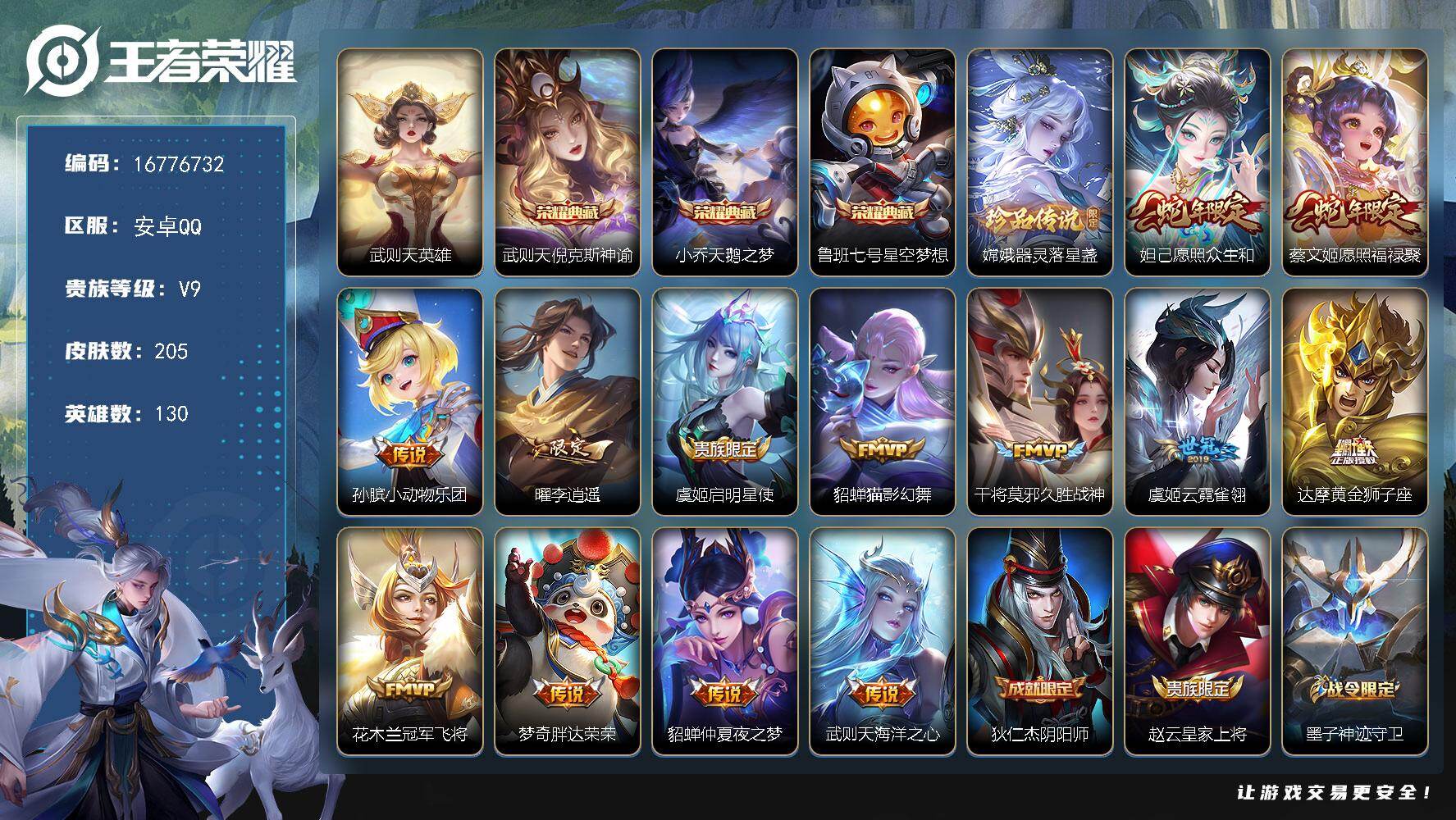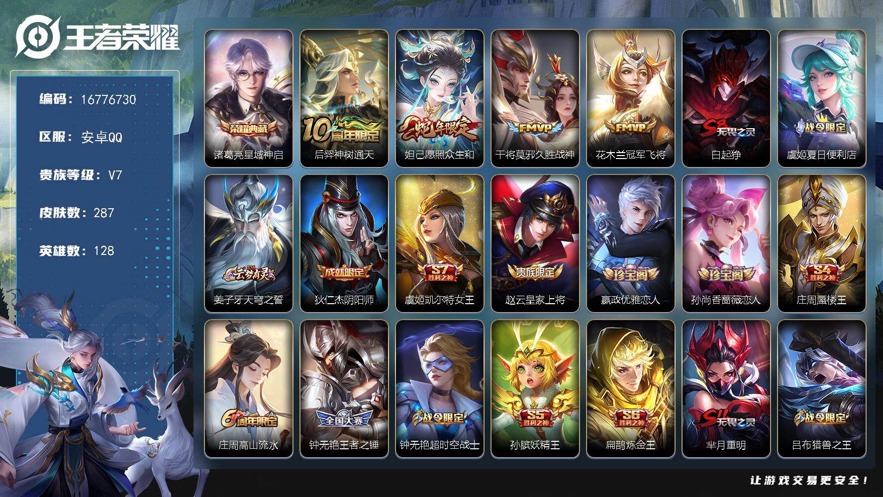 【西施全皮】实名: 可修改 贵族等级: V7 英雄数: 128 皮肤数: 25