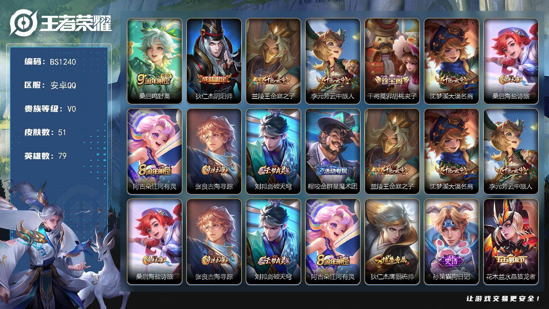 安卓Q-V0-秩序白银I段位-79英雄-51皮肤-1传说-10史诗【传说皮肤