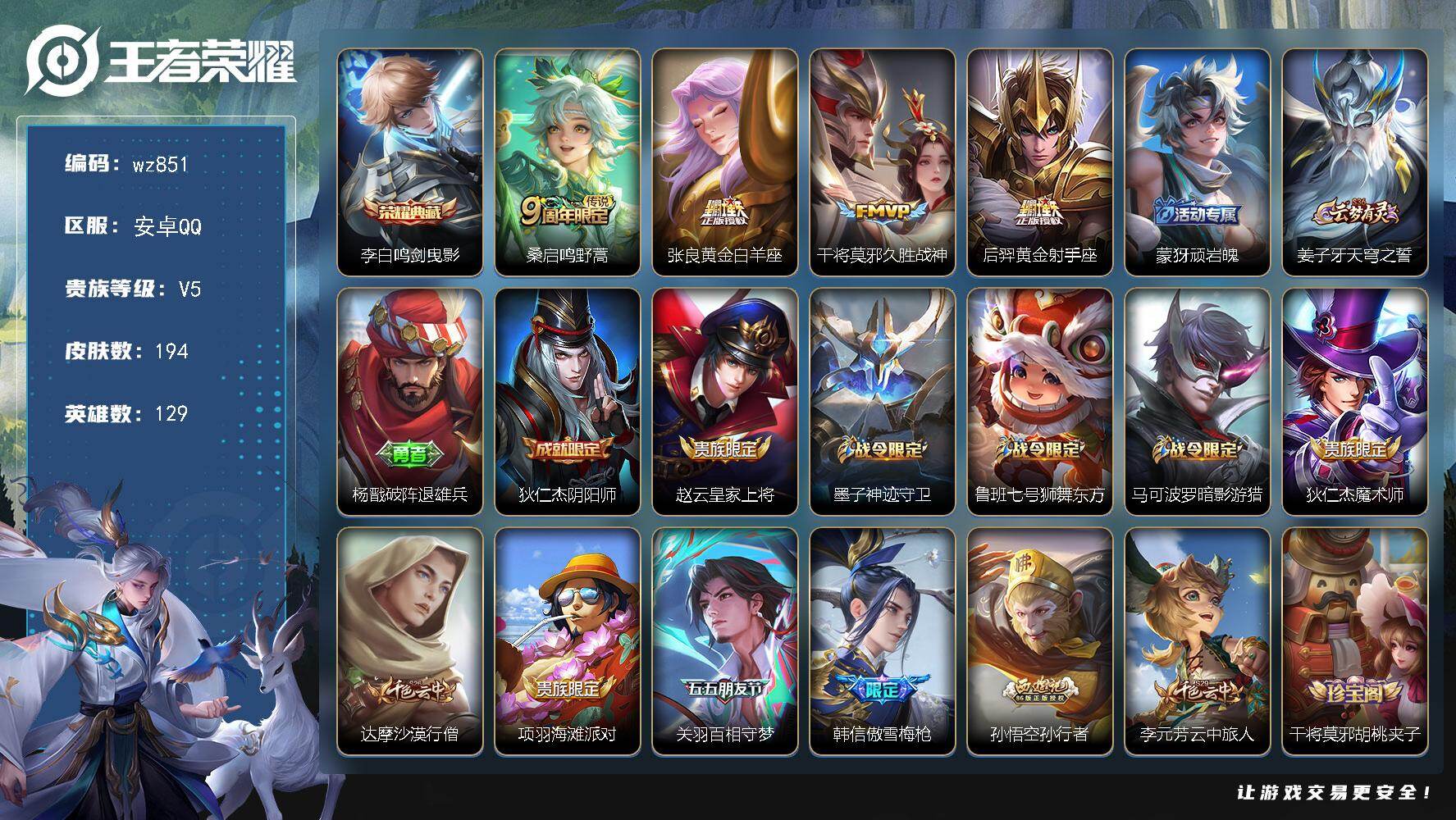 安卓Q-V5-至尊星耀IV段位-129英雄-194皮肤-1典藏皮肤-4传说-5