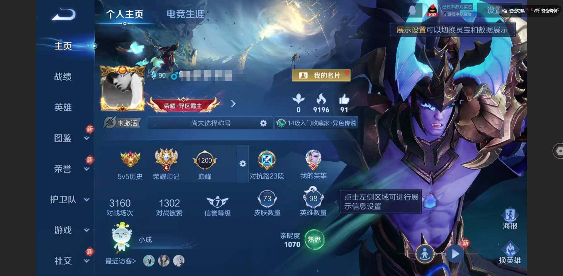 贵族等级: V5 英雄数: 98 皮肤数: 73 星传说: 幽冥之眼 传说皮: