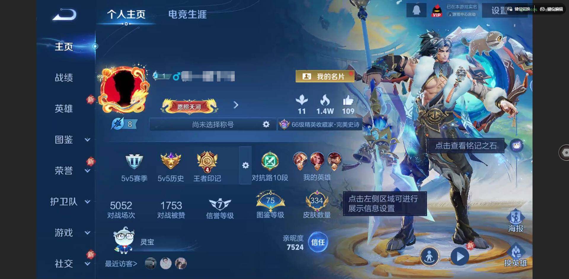 贵族等级: V8 英雄数: 126 皮肤数: 334 荣耀水晶: 鸣剑·曳影