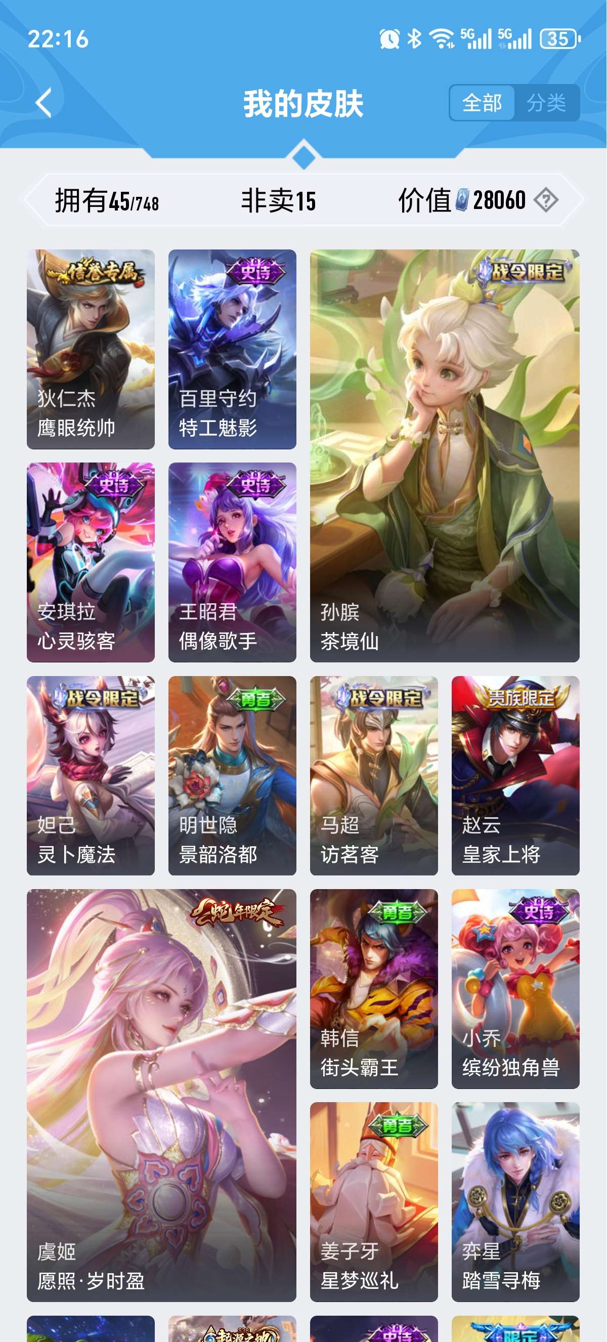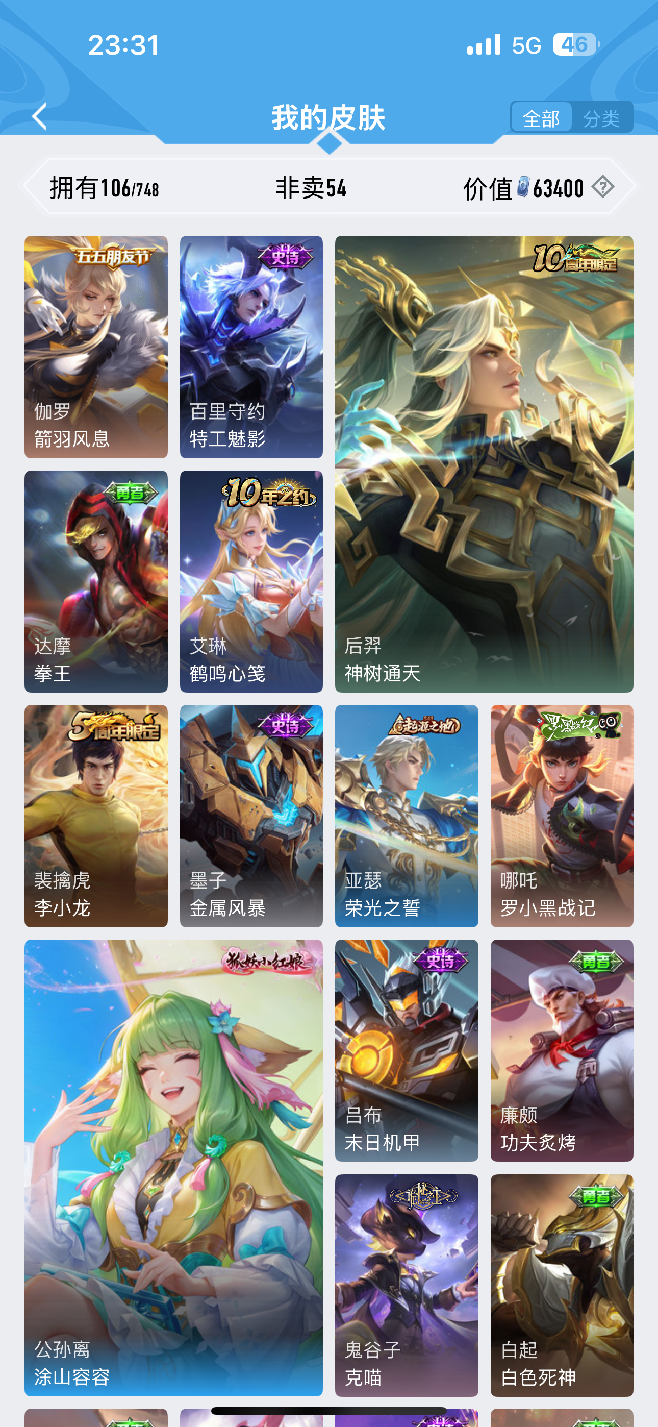 安卓QQ-1典藏-6传说-155皮肤-125英雄-无双王者-女号,,