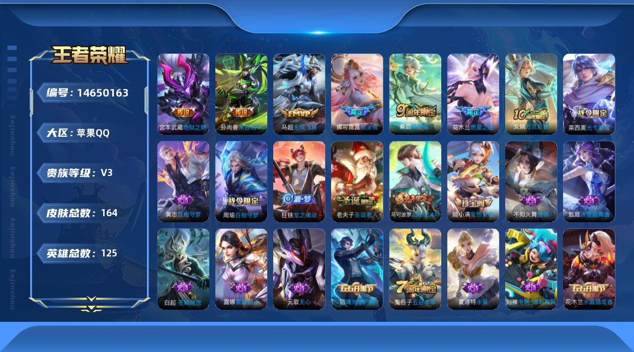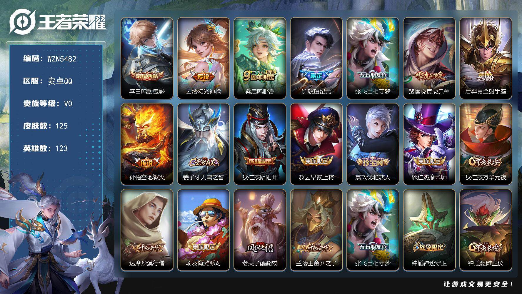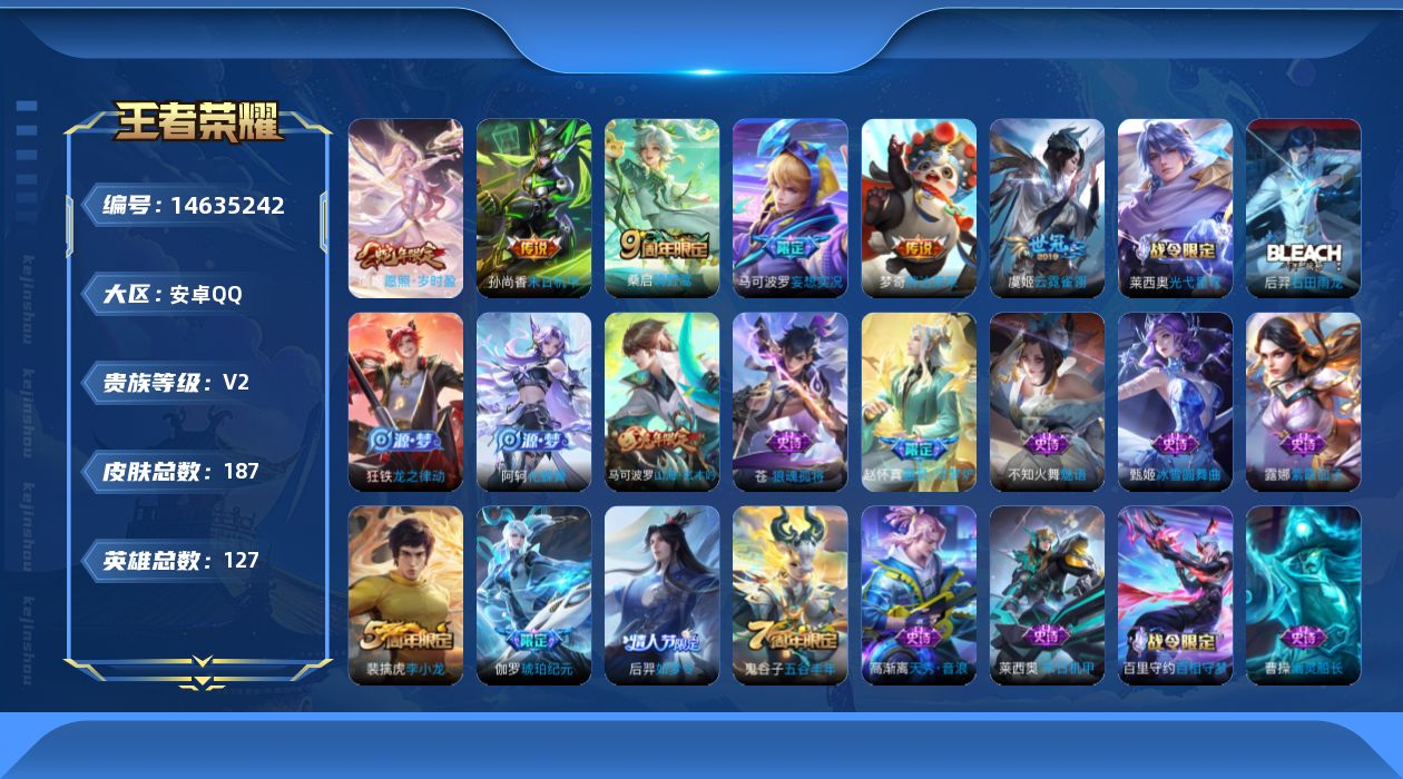 安卓QQ-1典藏-7传说-125皮肤-123英雄-永恒钻石-