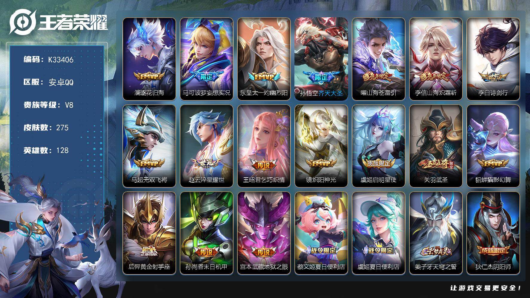 V8-永恒钻石V段位-128英雄-275皮肤-17传说-75史诗