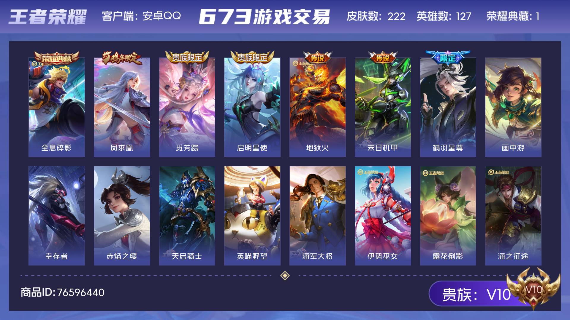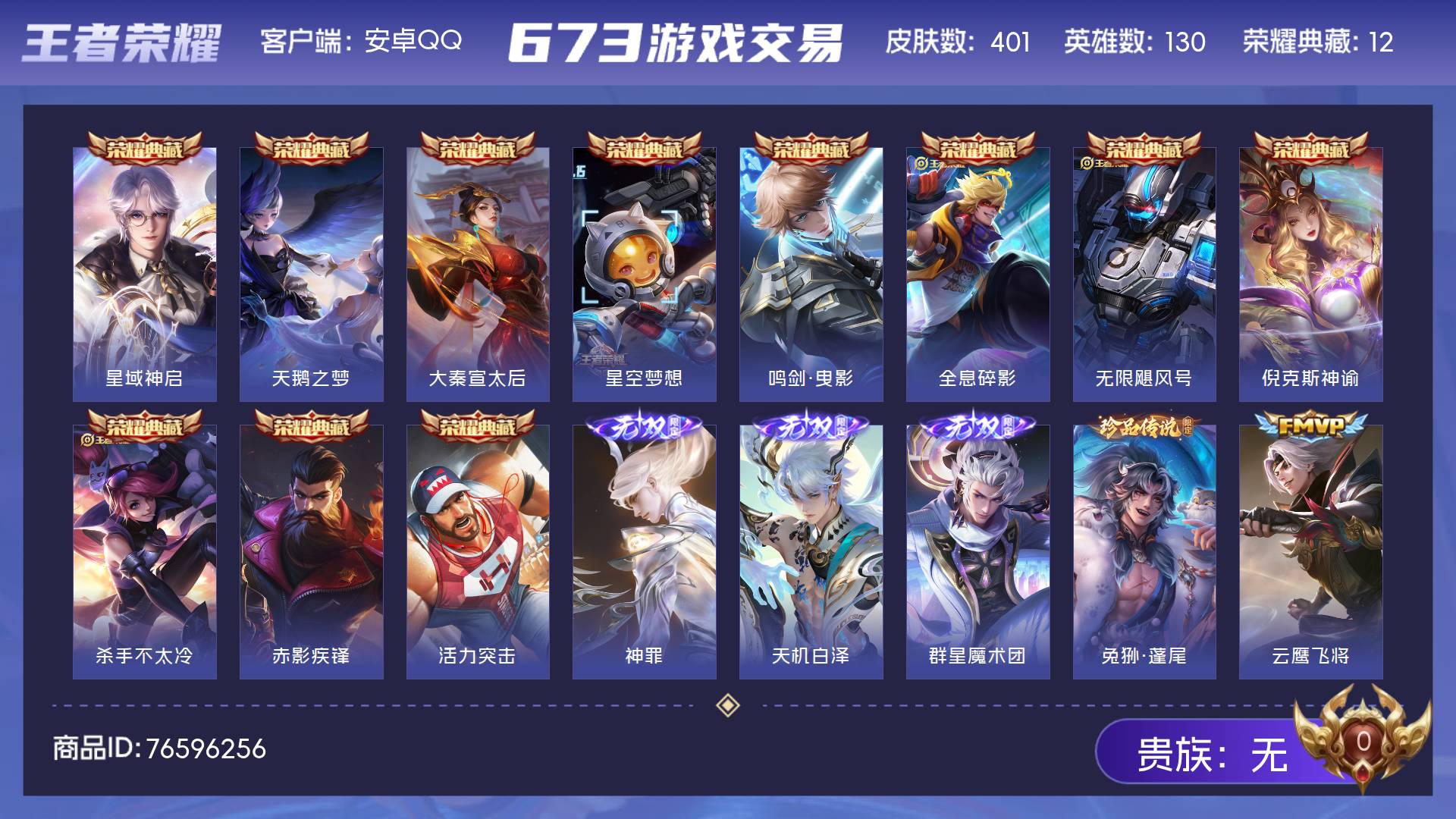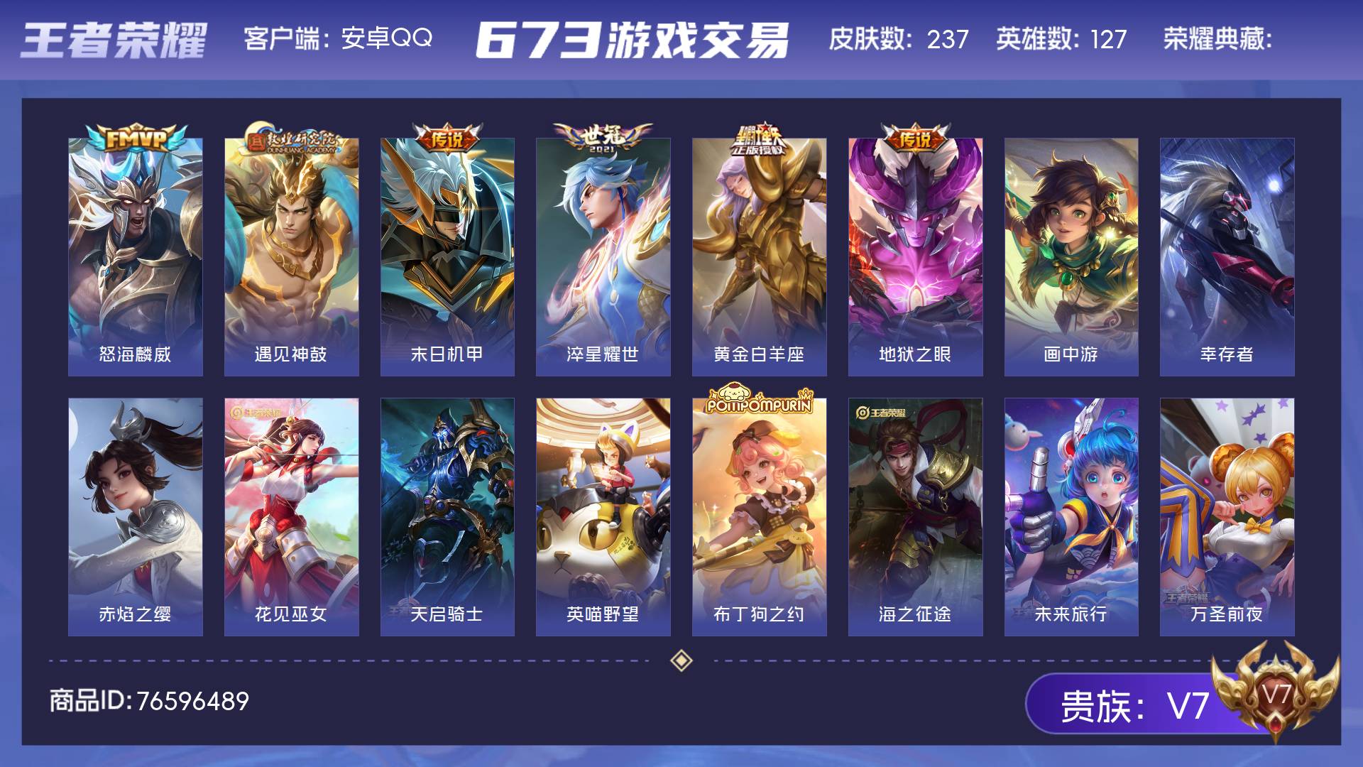 安卓Q-无双贵族-满英雄-733皮-17典藏-12无双-7珍品传说-1珍品无双-131传说-7天幕-顶级极品号