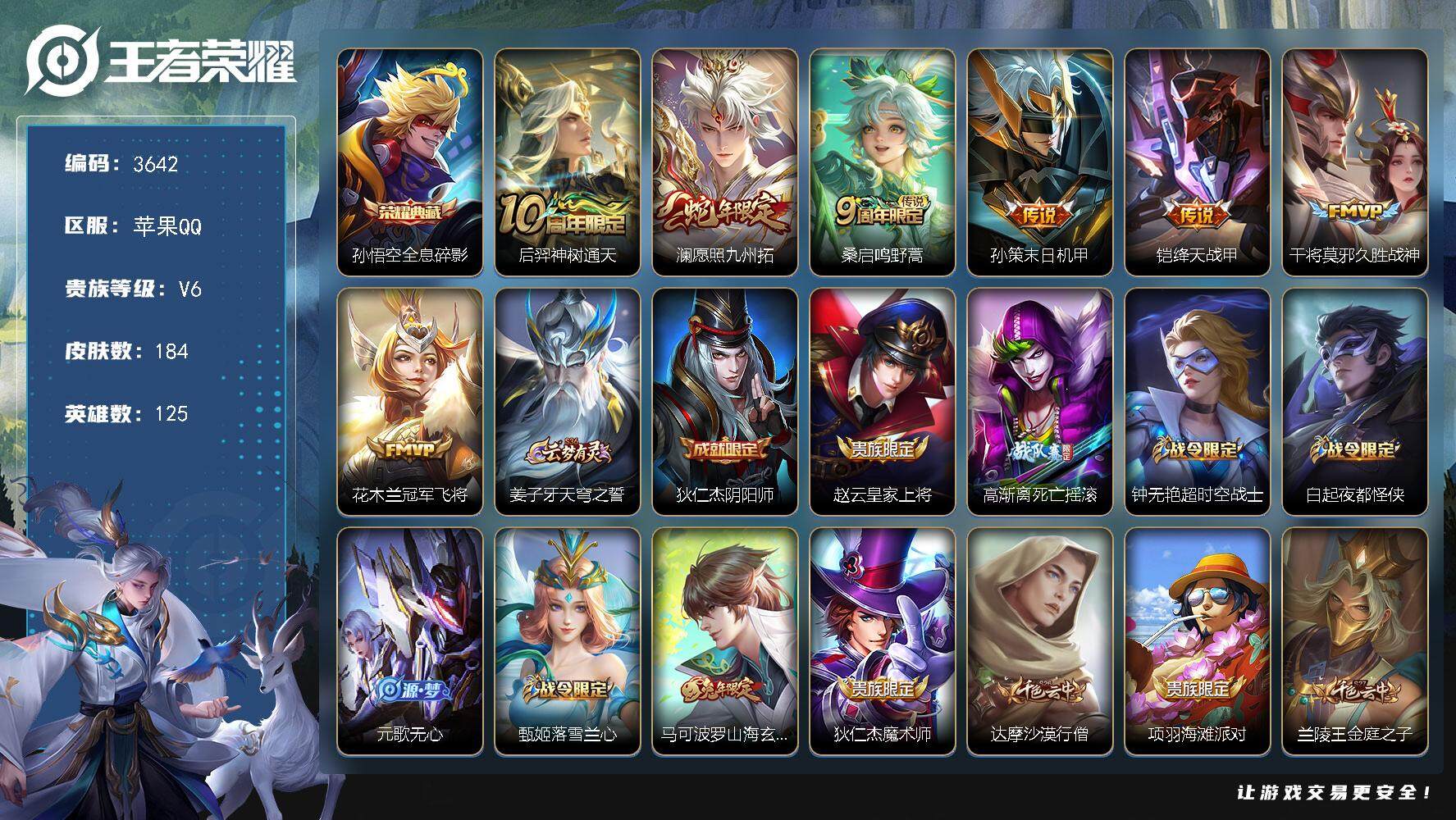 苹果Q-V6-最强王者段位-125英雄-184皮肤-1典藏皮肤-7传说-47史