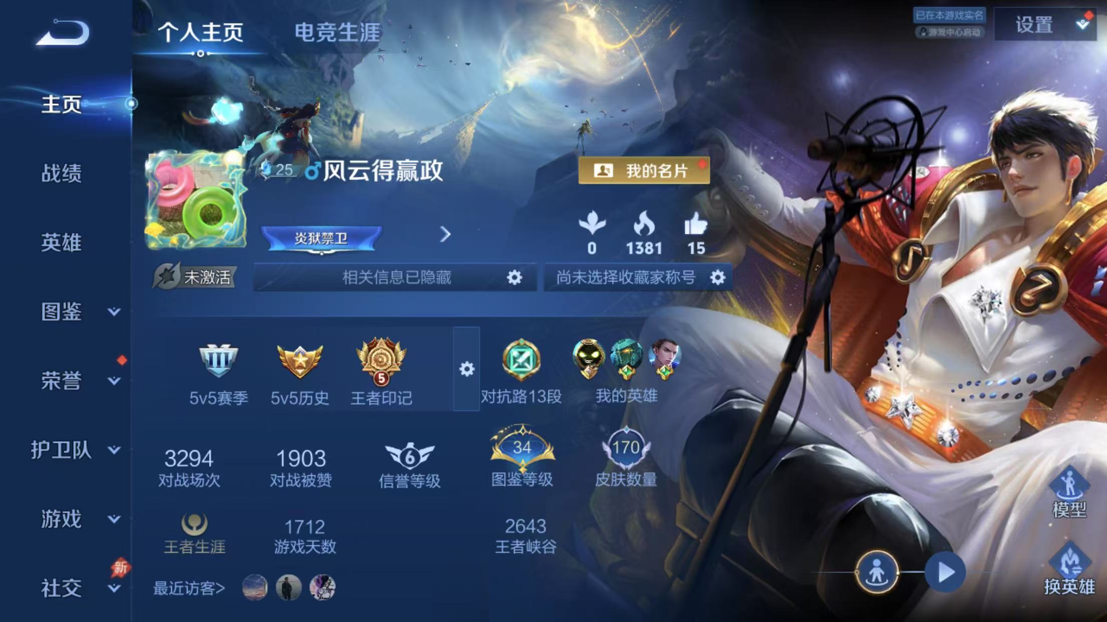 贵族等级: V6 英雄数: 128 皮肤数: 157 荣耀水晶: 无限飓风号