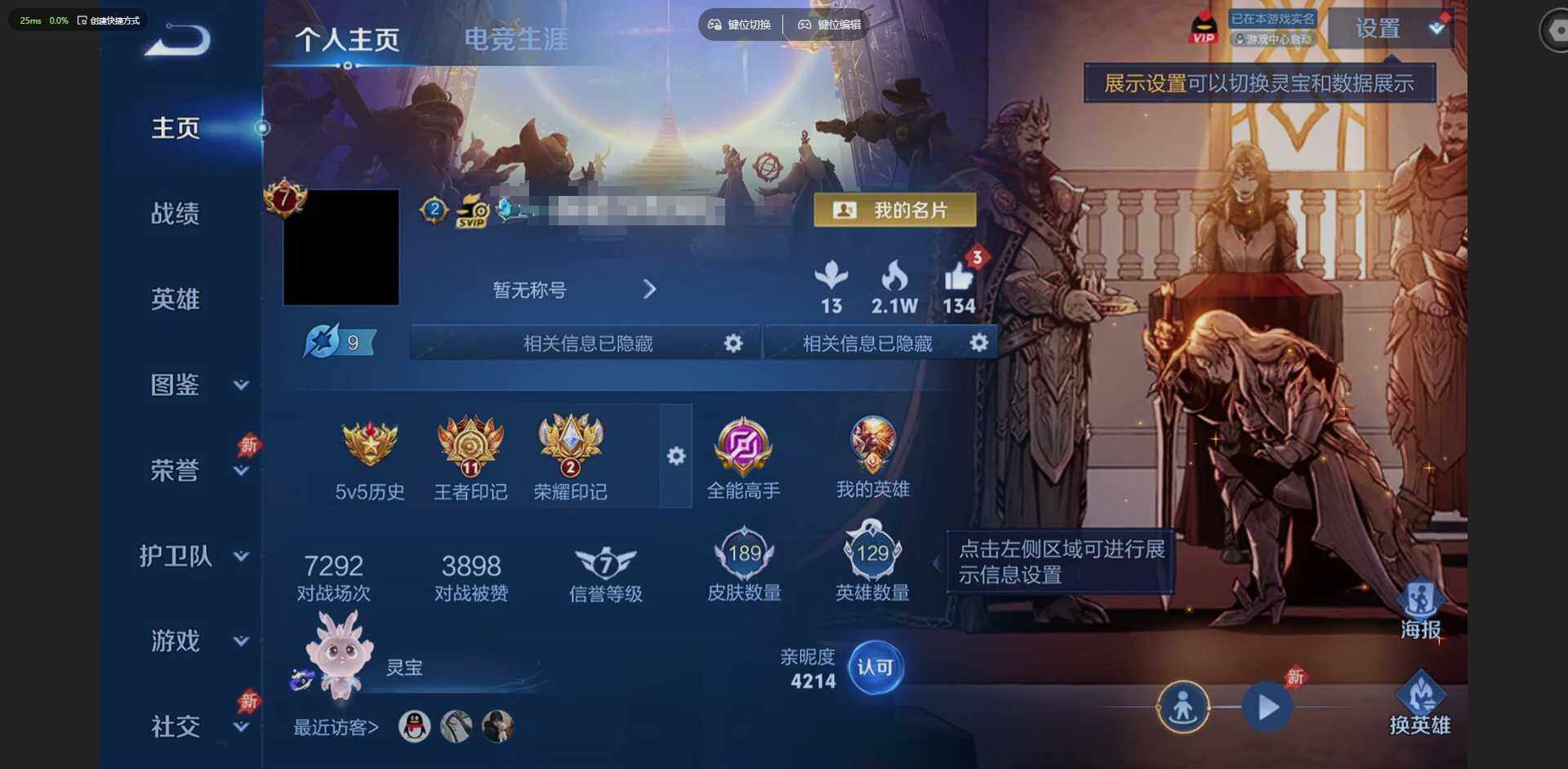 贵族等级: V7 英雄数: 129 皮肤数: 189 荣耀水晶: 银白咏叹调