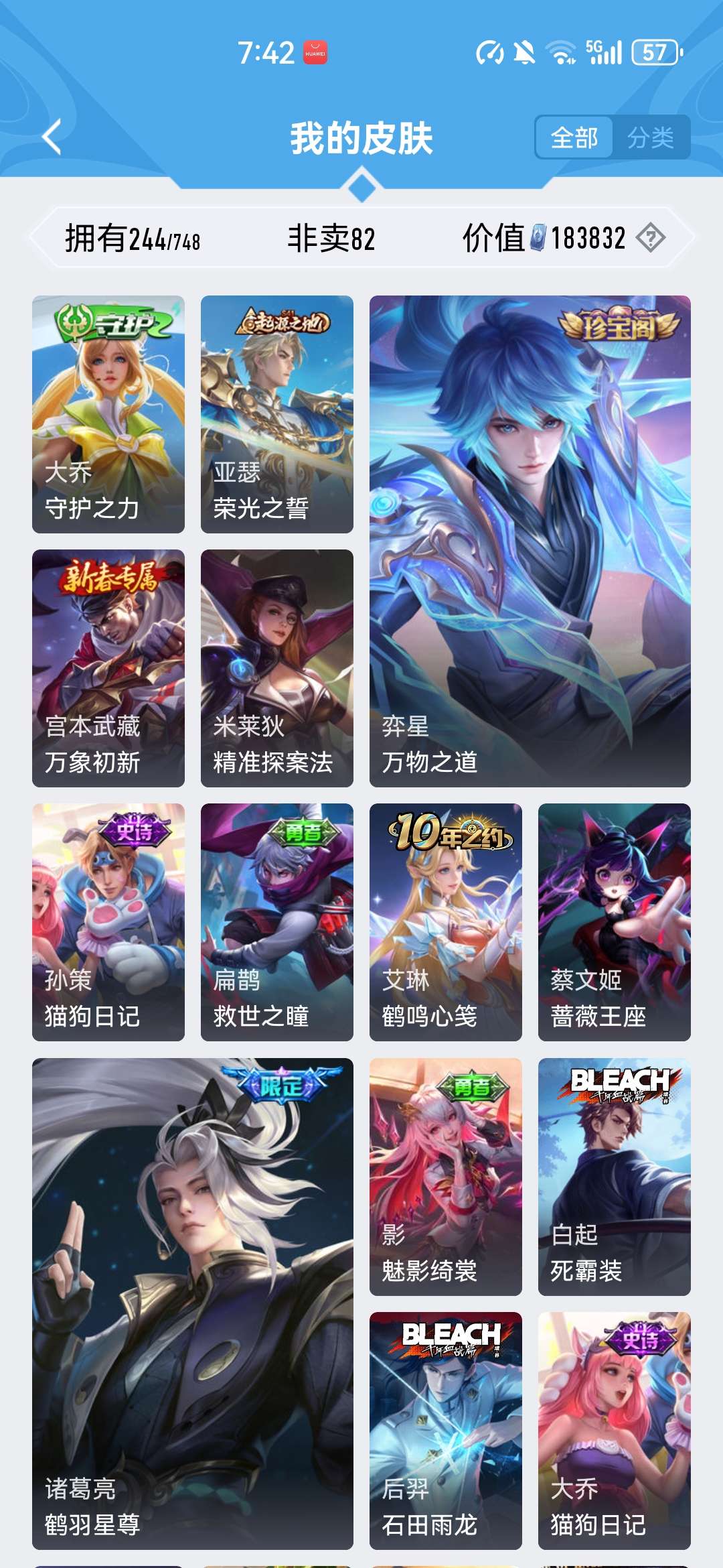 安卓QQ/绝世王者/219皮肤/125英雄/2典藏/0珍品无双/1无双/3珍品传说/14传说/78史