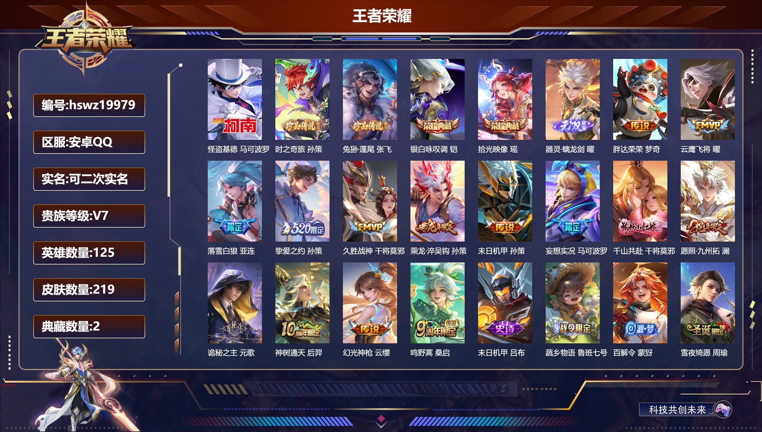 安卓QQ/传奇王者/413皮肤/125英雄/2典藏/0珍品无双/1无双/1珍品传说/28传说/131