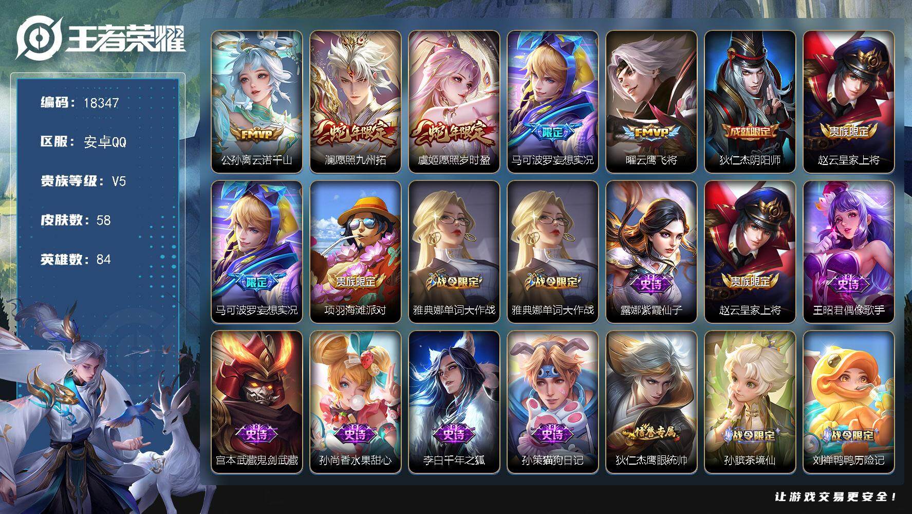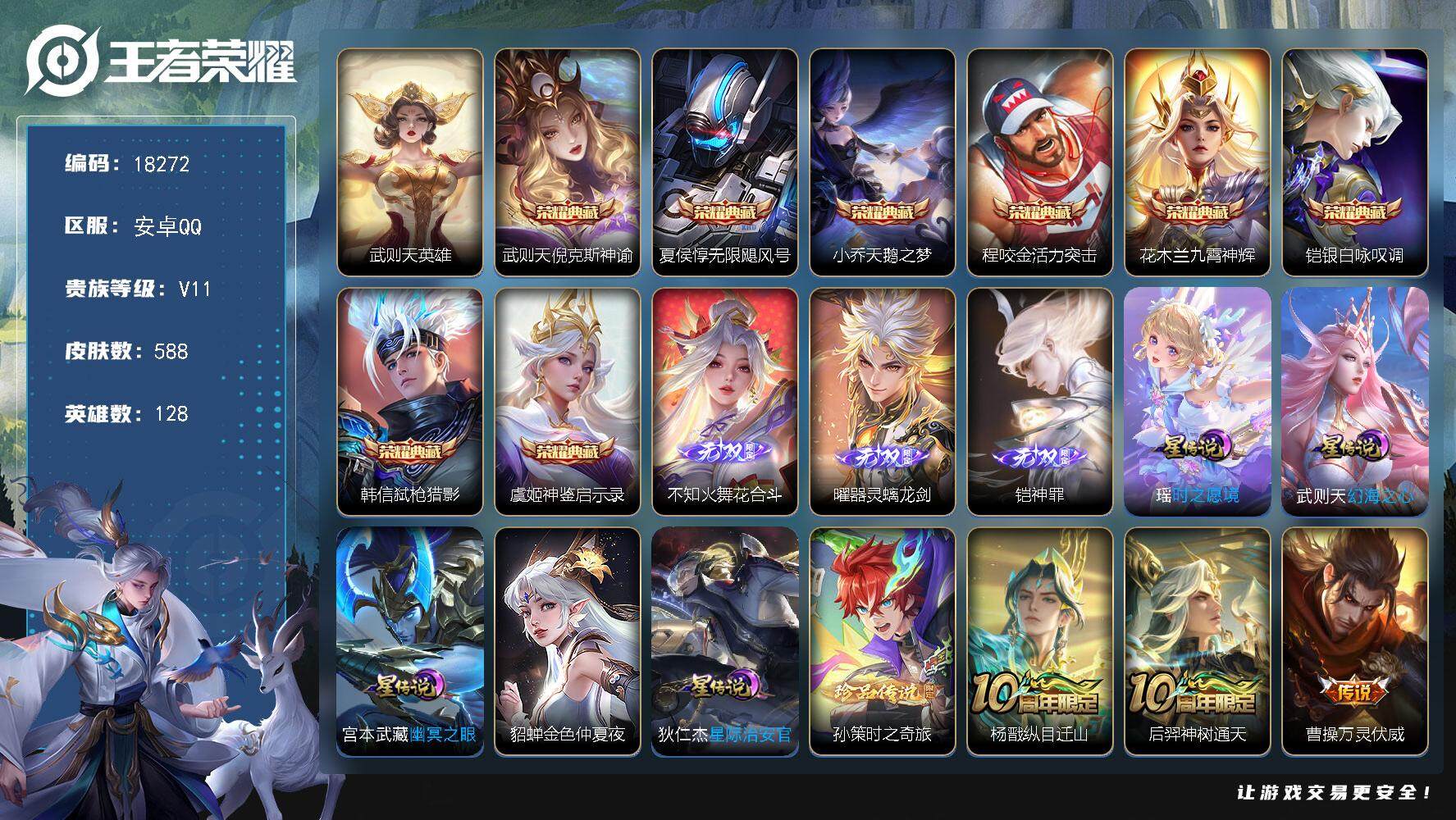 安卓QQ/荣耀王者/241皮肤/127英雄/1典藏/0珍品无双/3无双/1珍品传说/10传说/77史