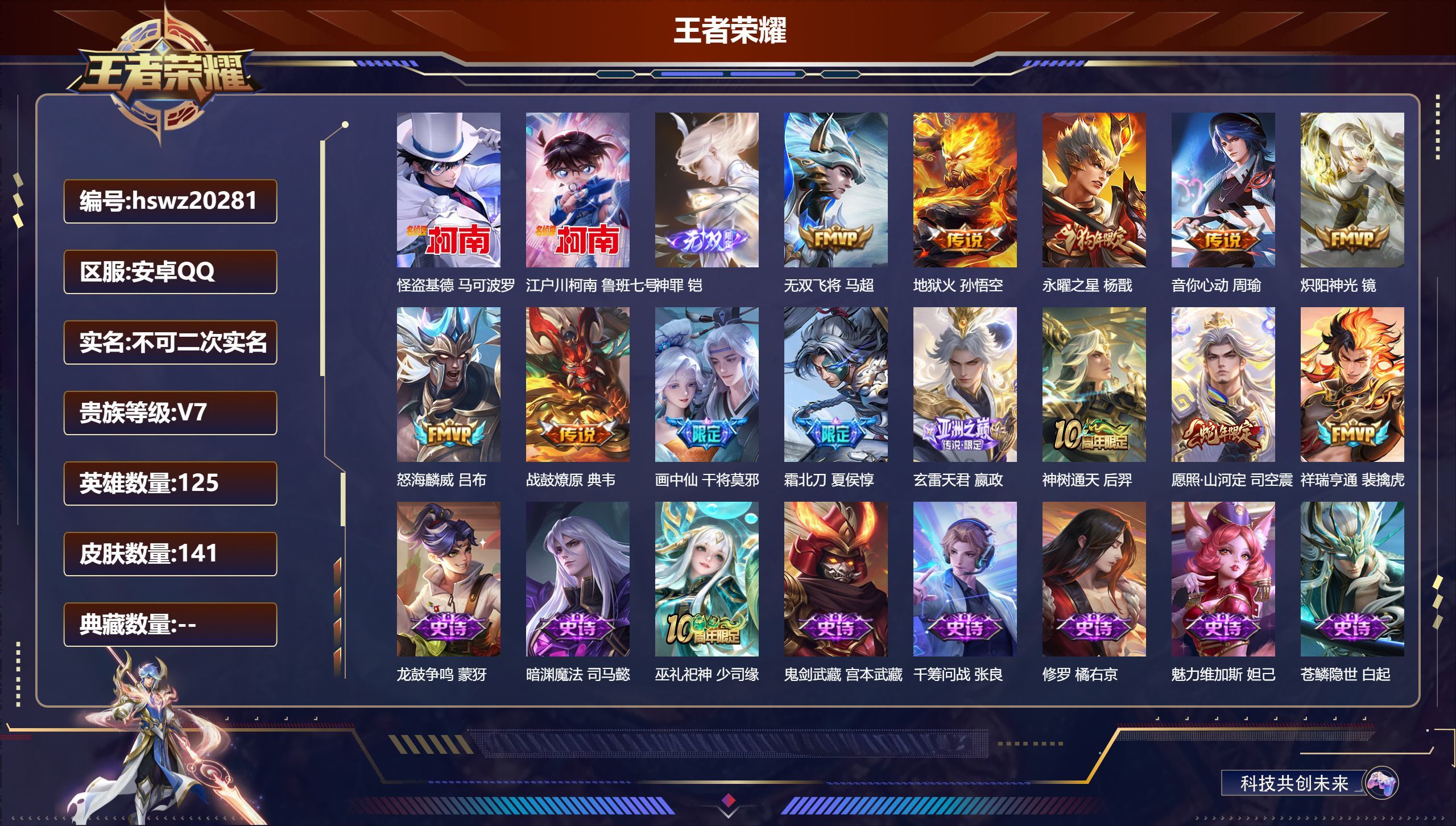 安卓QQ/无双王者/141皮肤/125英雄/0典藏/0珍品无双/1无双/2珍品传说/13传说/38史