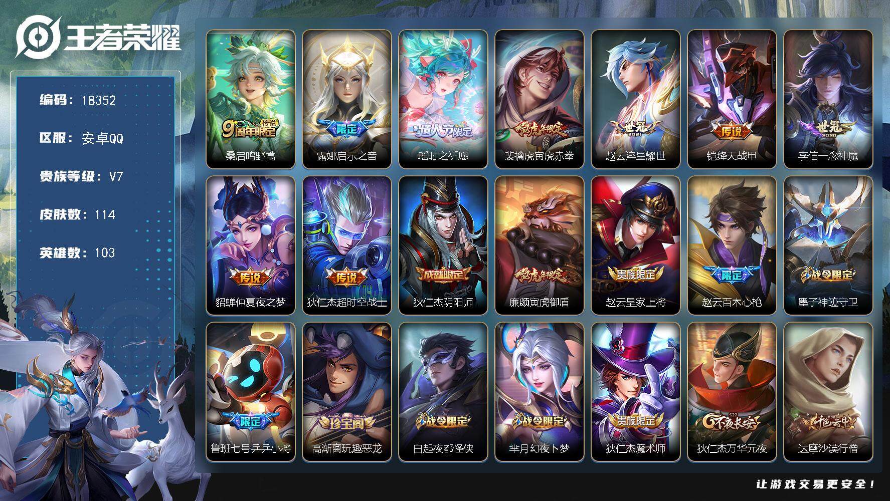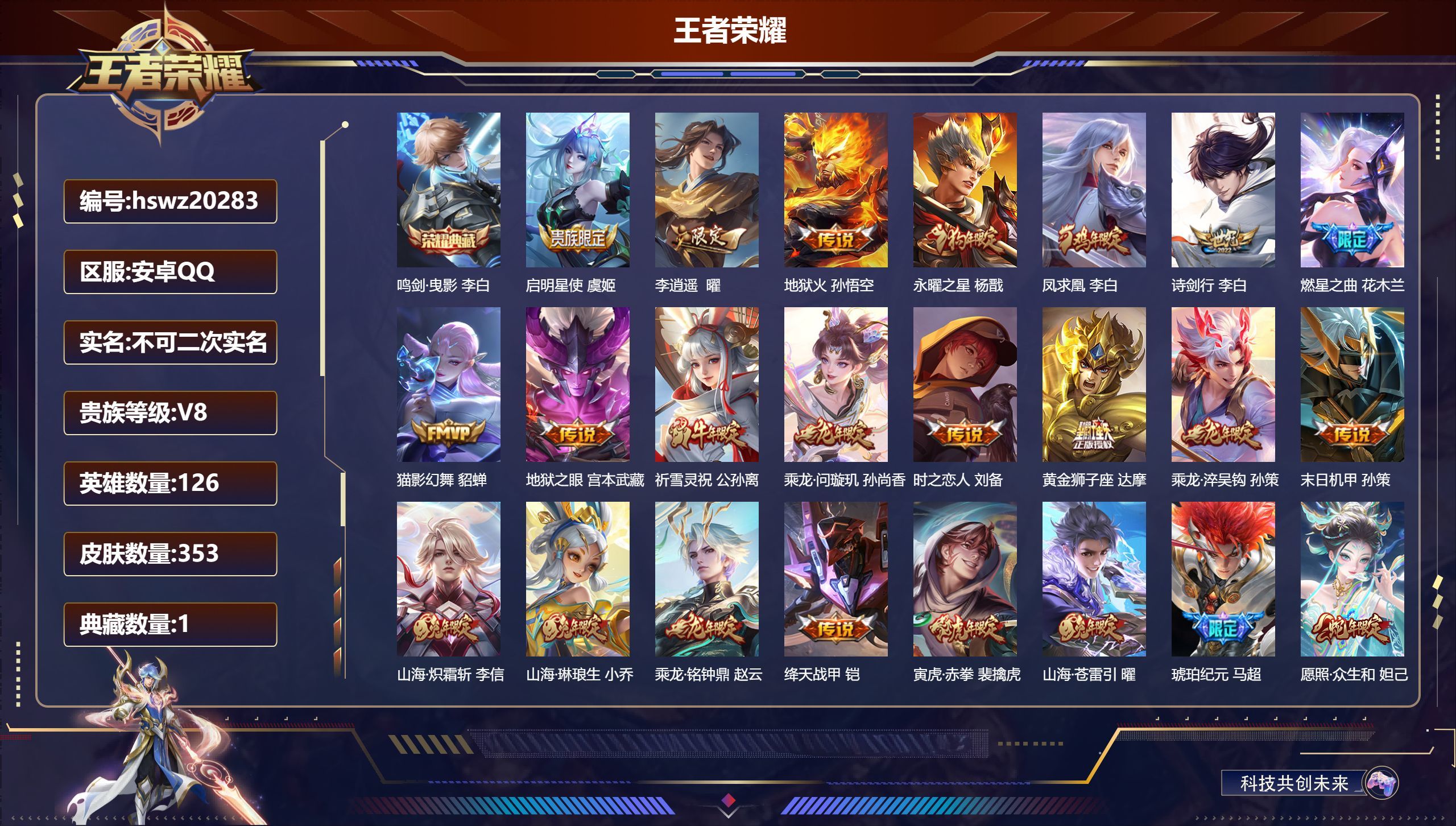 安卓QQ/荣耀王者/353皮肤/126英雄/1典藏/0珍品无双/0无双/0珍品传说/25传说/99史