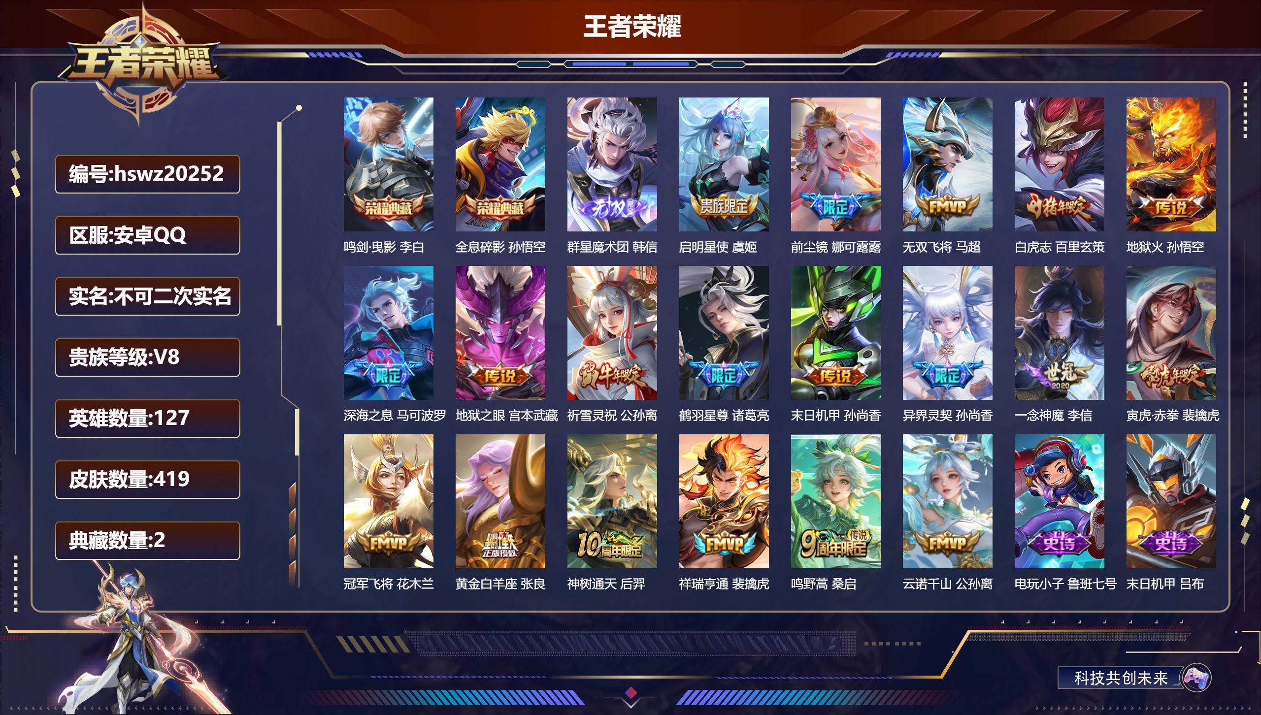 安卓QQ/荣耀王者/419皮肤/127英雄/2典藏/0珍品无双/1无双/0珍品传说/19传说/123