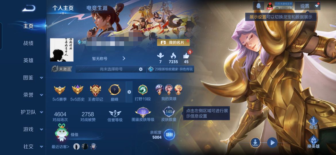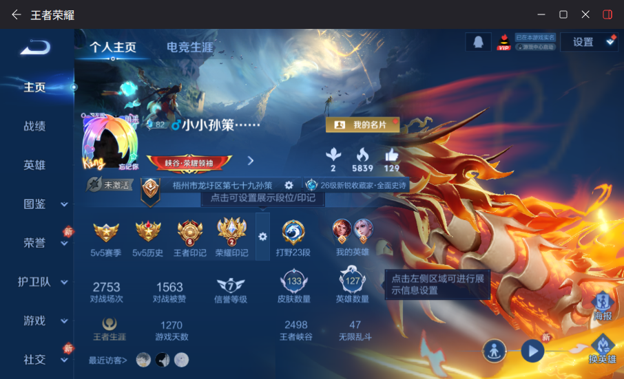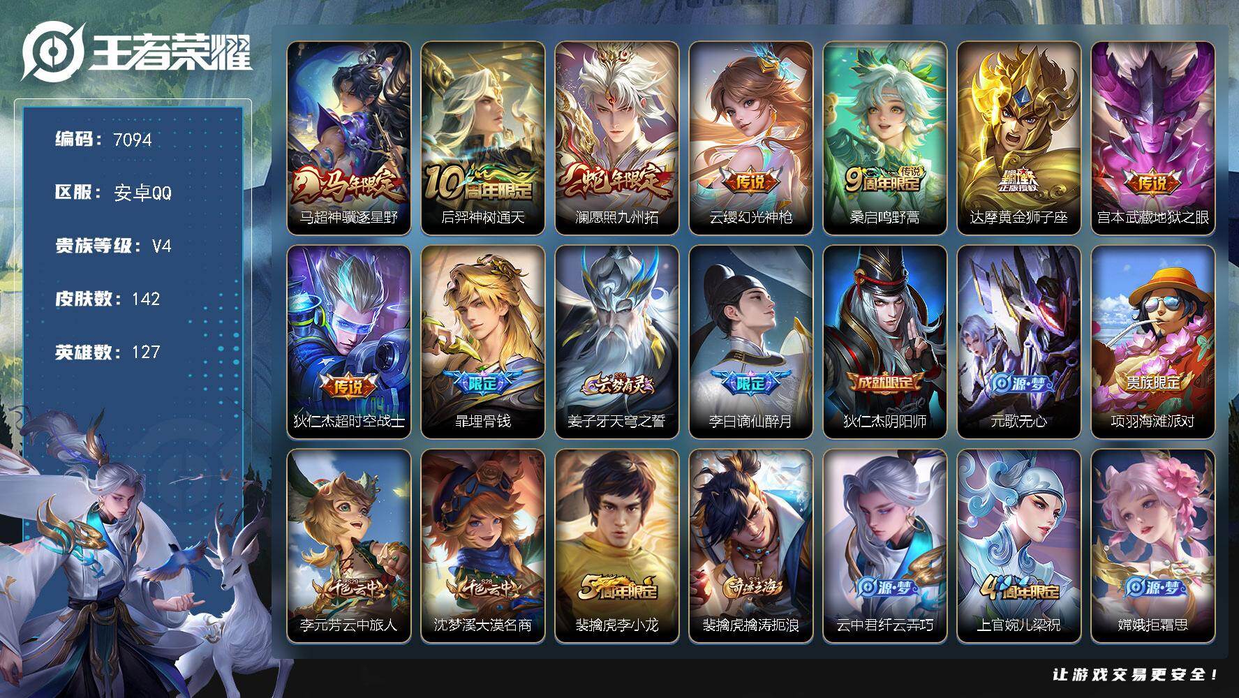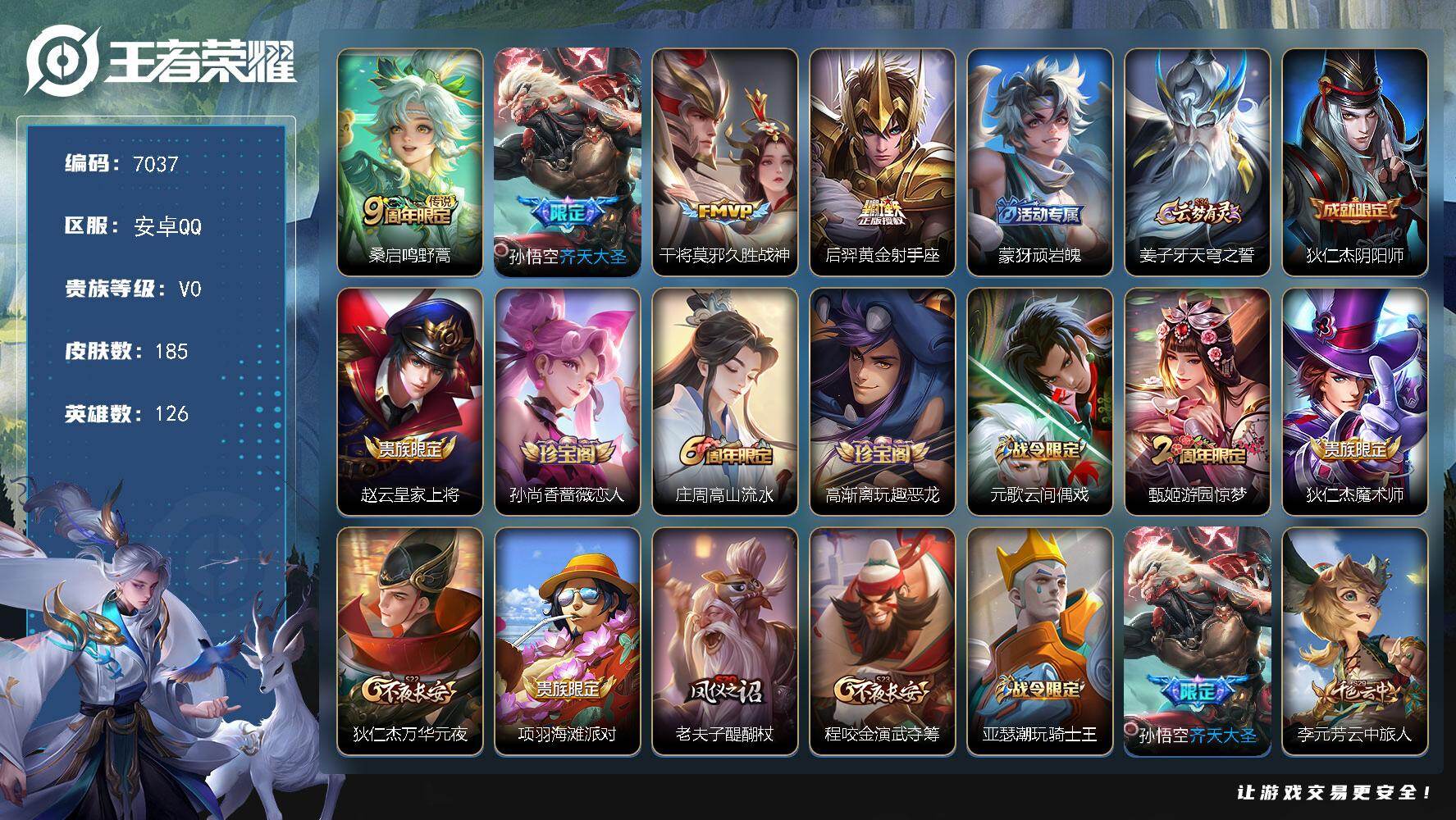 实名: 可修改 贵族等级: V5 英雄数: 126 皮肤数: 126 传说皮: