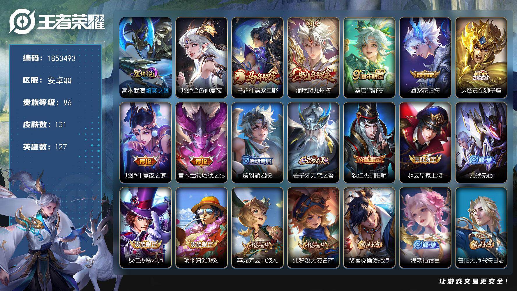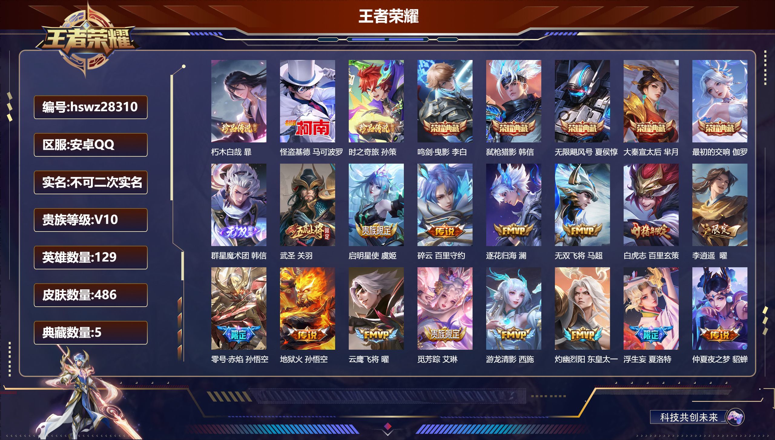 安卓QQ/至尊星耀/486皮肤/129英雄/5典藏/0珍品无双/1无双/3珍品传说/35传说/156