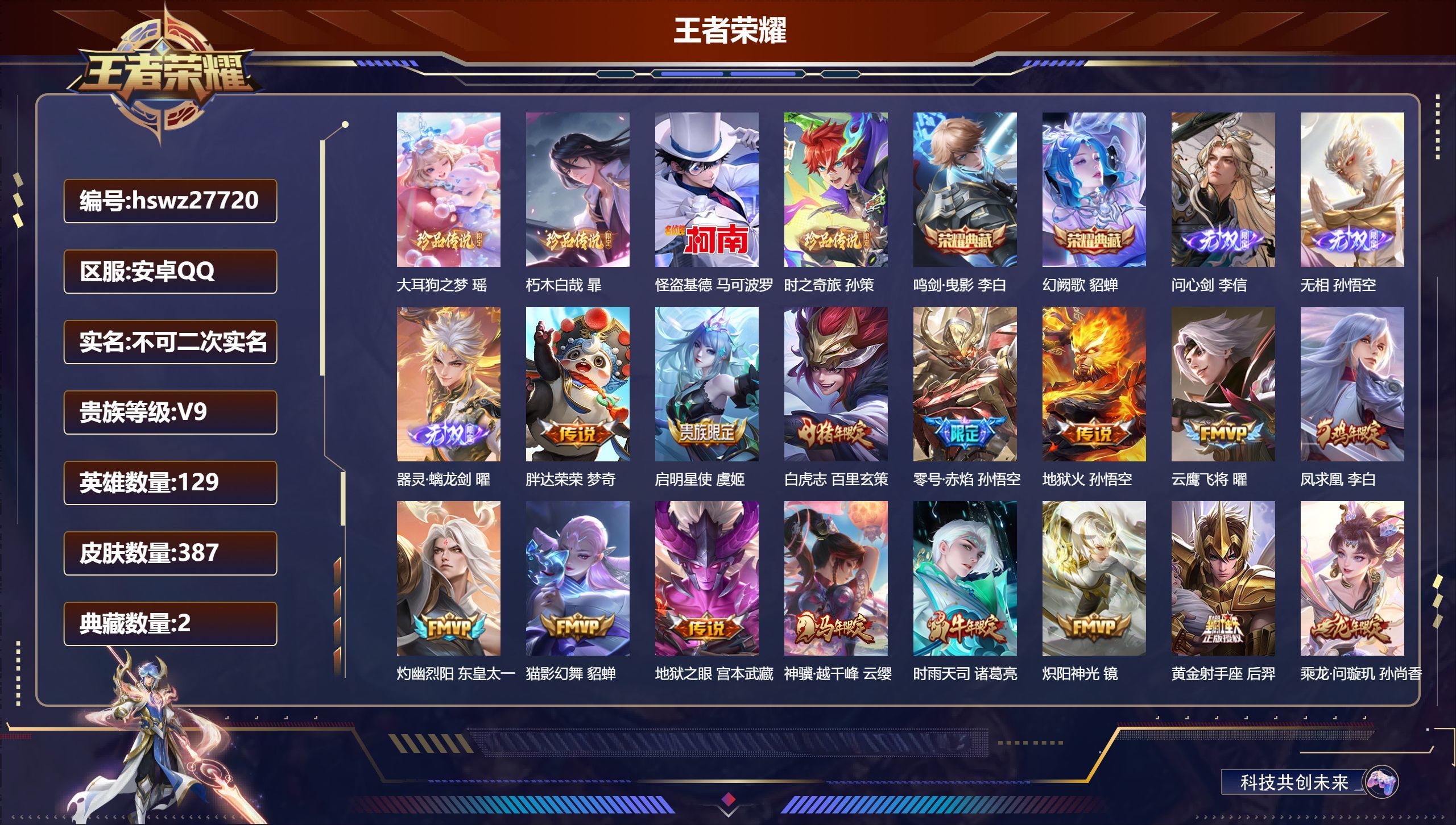 安卓QQ/至尊星耀/412皮肤/129英雄/3典藏/0珍品无双/2无双/2珍品传说/16传说/116