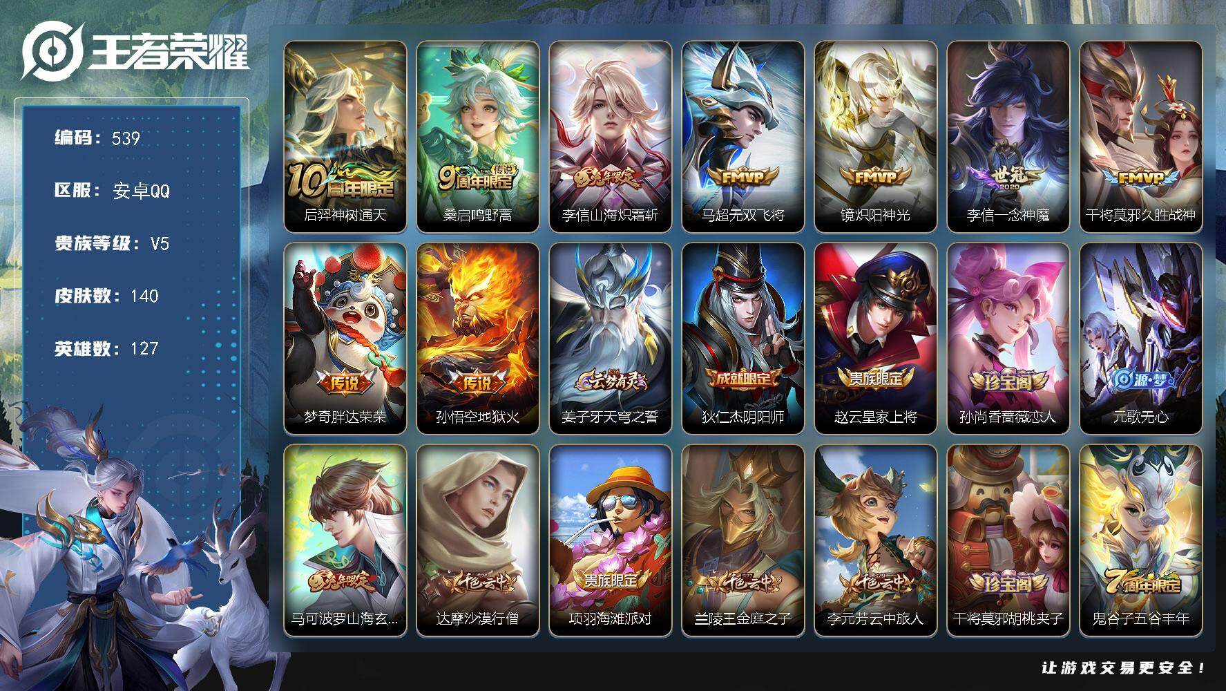 安卓QQ/至尊星耀/239皮肤/128英雄/1典藏/0珍品无双/2无双/0珍品传说/27传说/74史