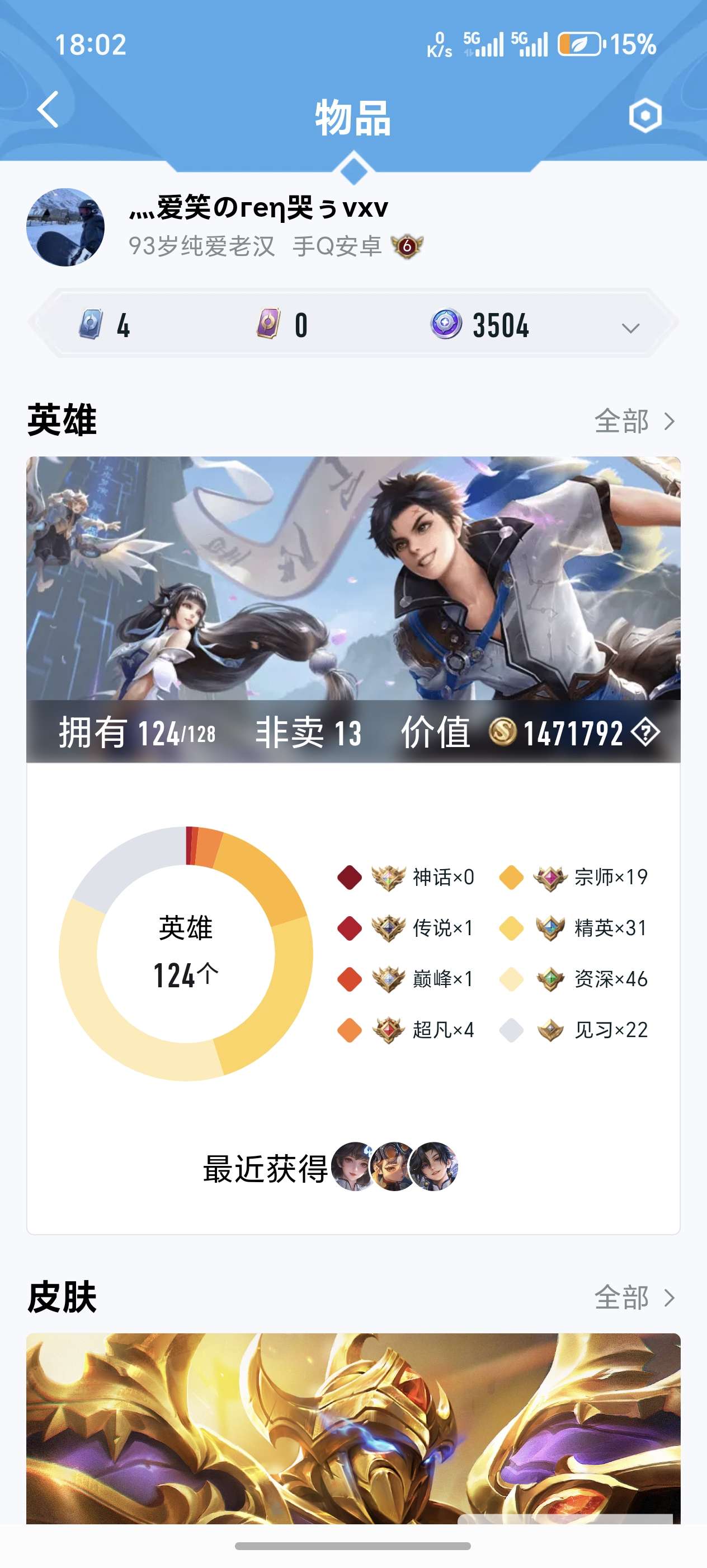 苹果微信-3典藏-25传说-299皮肤-124英雄-永恒钻石-营地 自己看皮肤