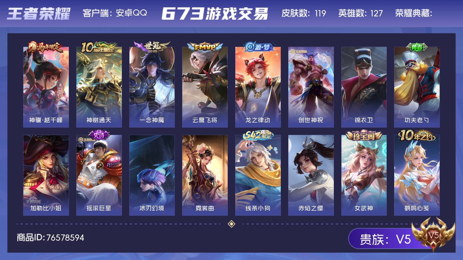 实名: 可修改 贵族等级: V5 英雄数: 79 皮肤数: 59 传说皮: 浮