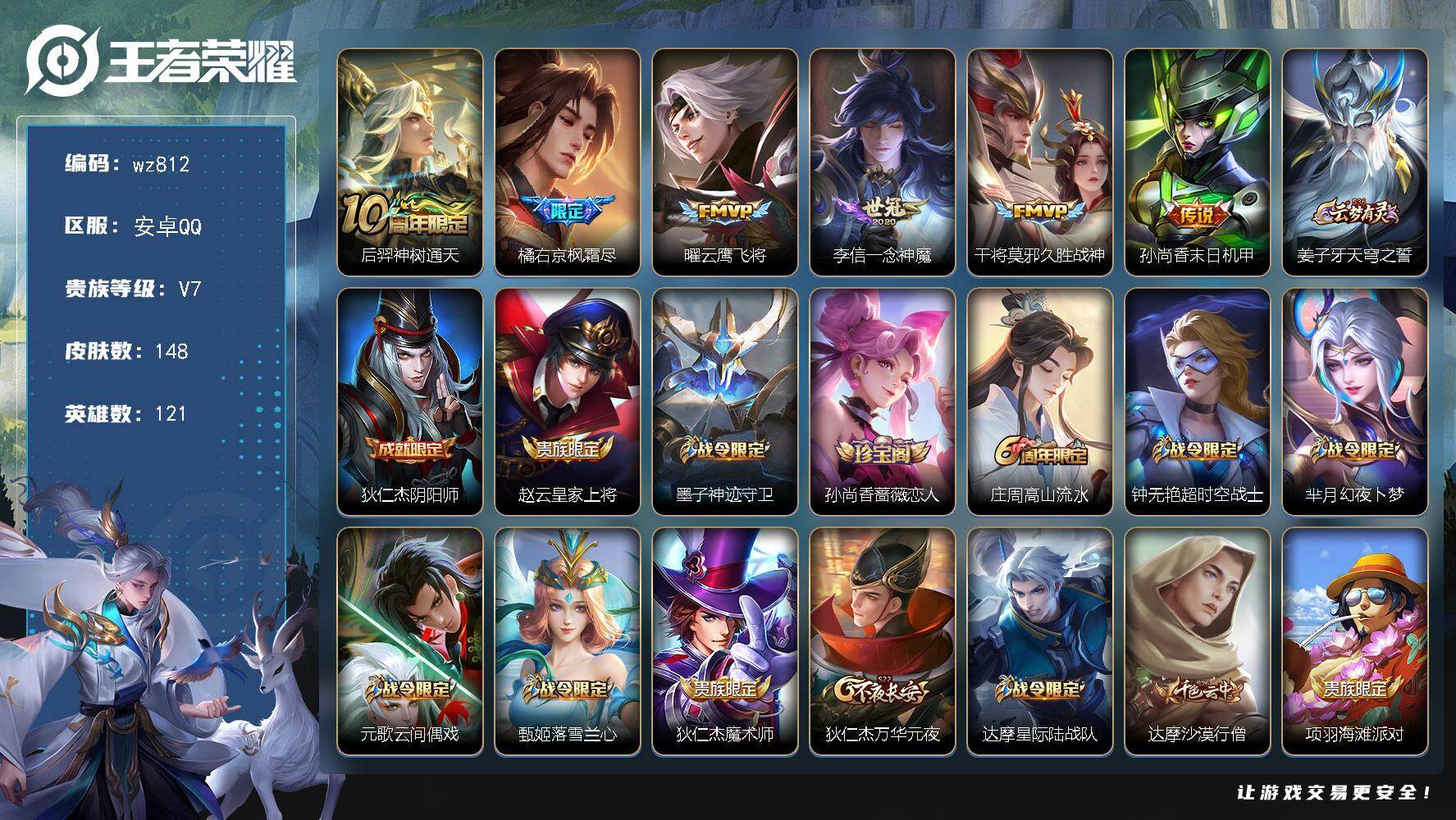 【金标嫦娥】实名: 可修改 贵族等级: V7 英雄数: 122 皮肤数: 13