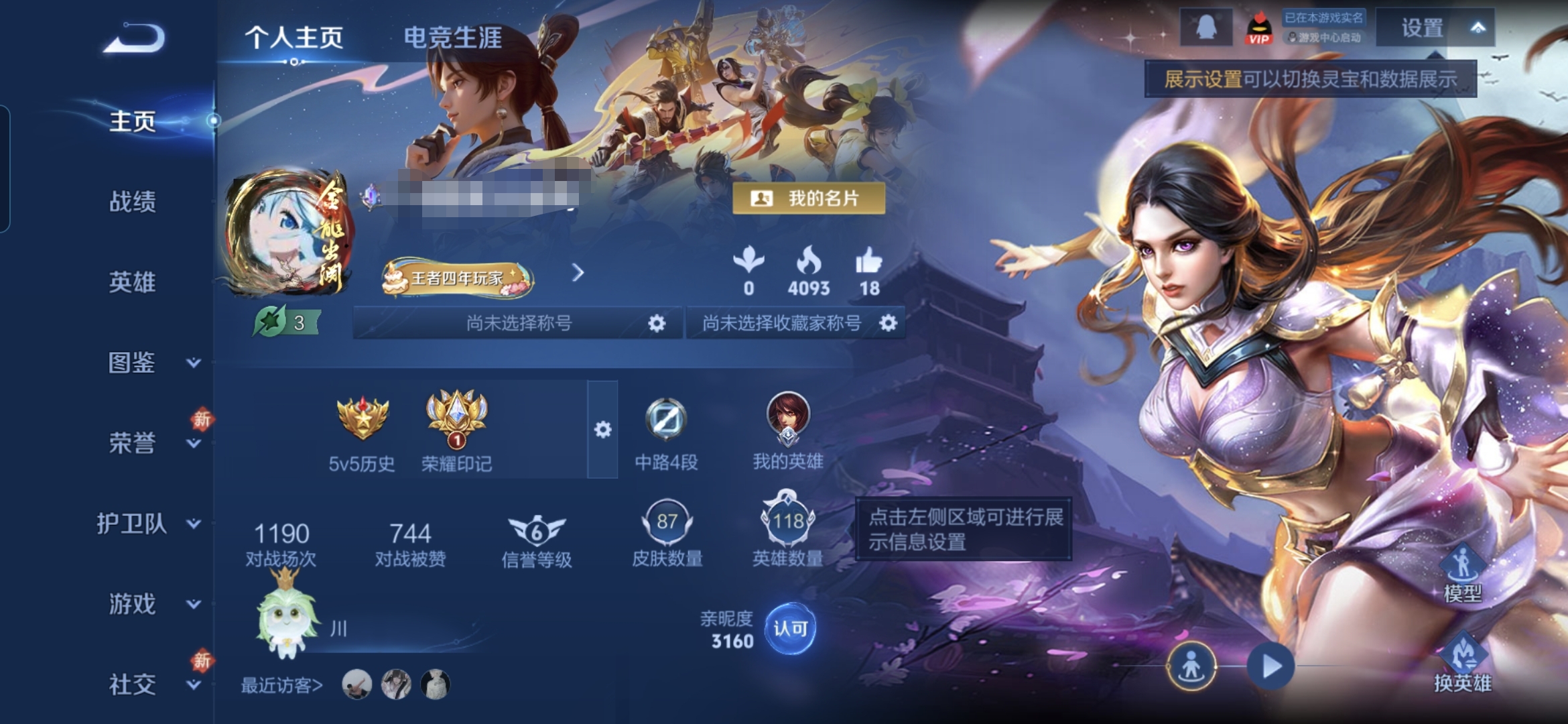 实名: 可修改 贵族等级: V4 英雄数: 126 皮肤数: 105 荣耀水晶
