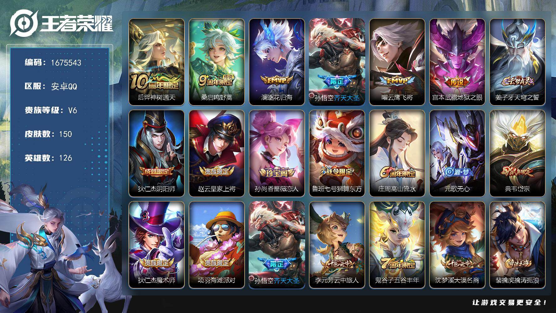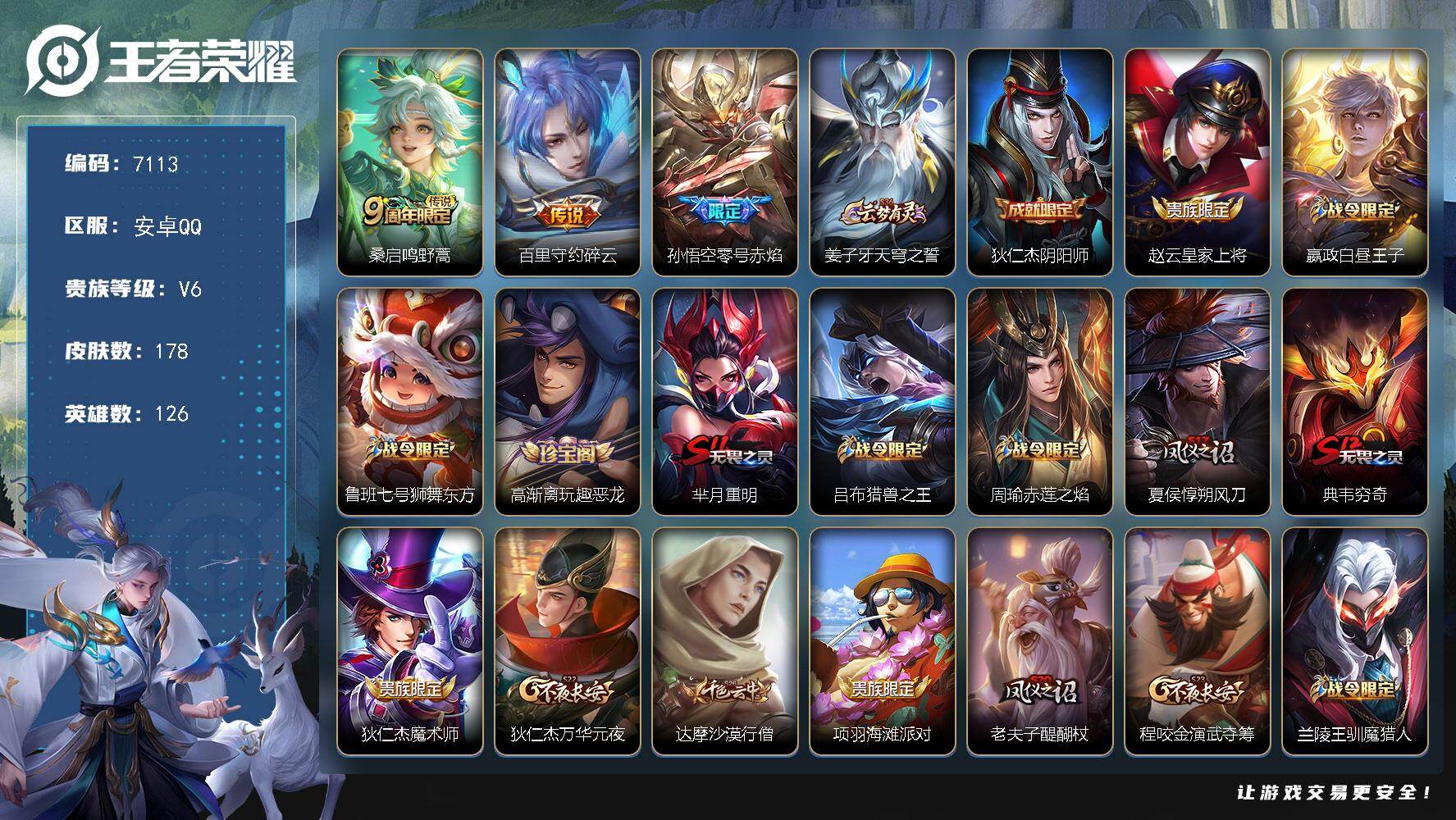 安卓Q-V1-至尊星耀III段位-127英雄-148皮肤-6传说-26史诗【