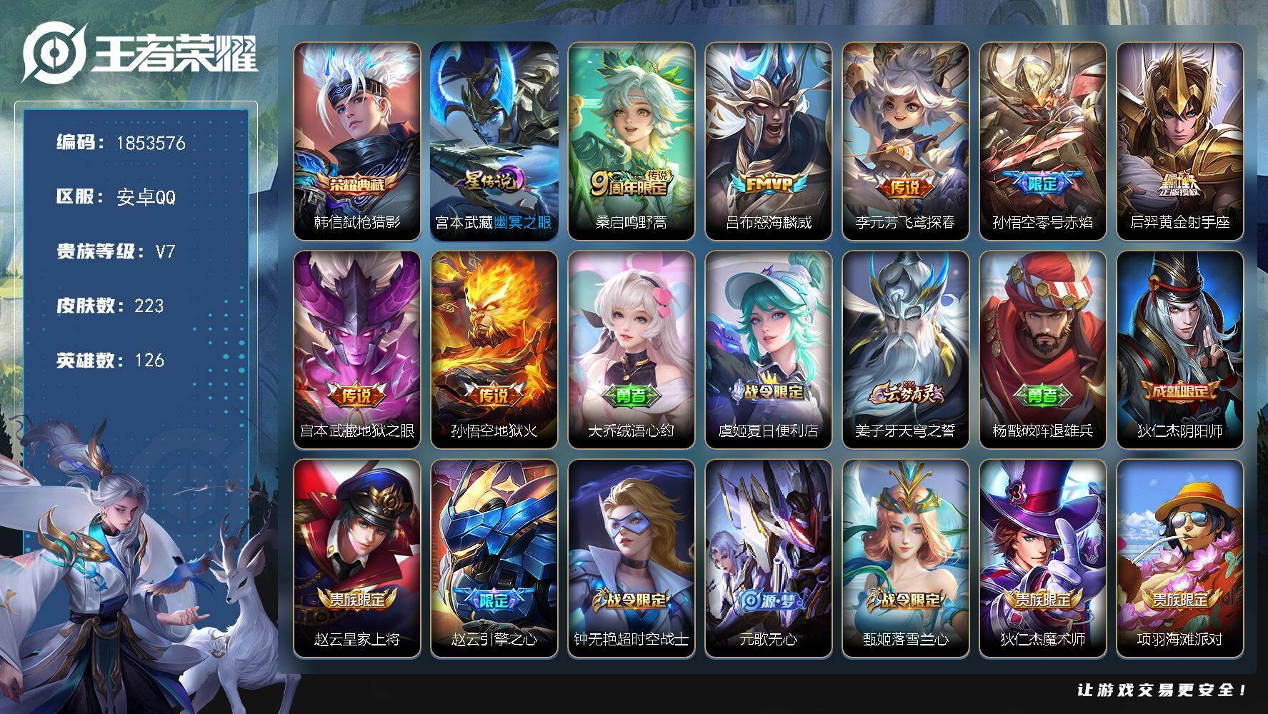 V7-尊贵铂金I段位-126英雄-223皮肤-1典藏皮肤-7传说-54史诗