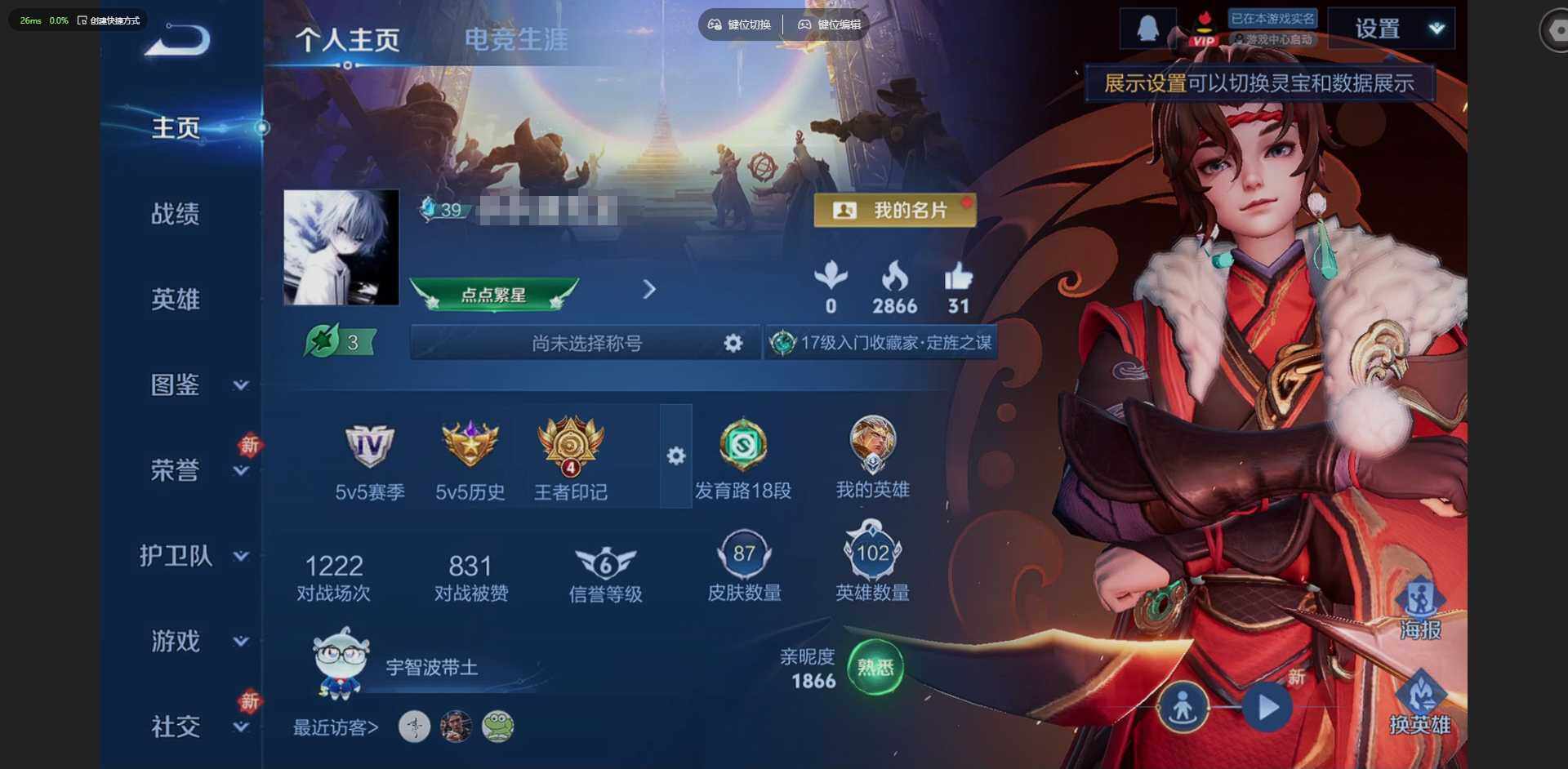 贵族等级: V5 英雄数: 102 皮肤数: 87 传说皮: 黄金射手座,冠军