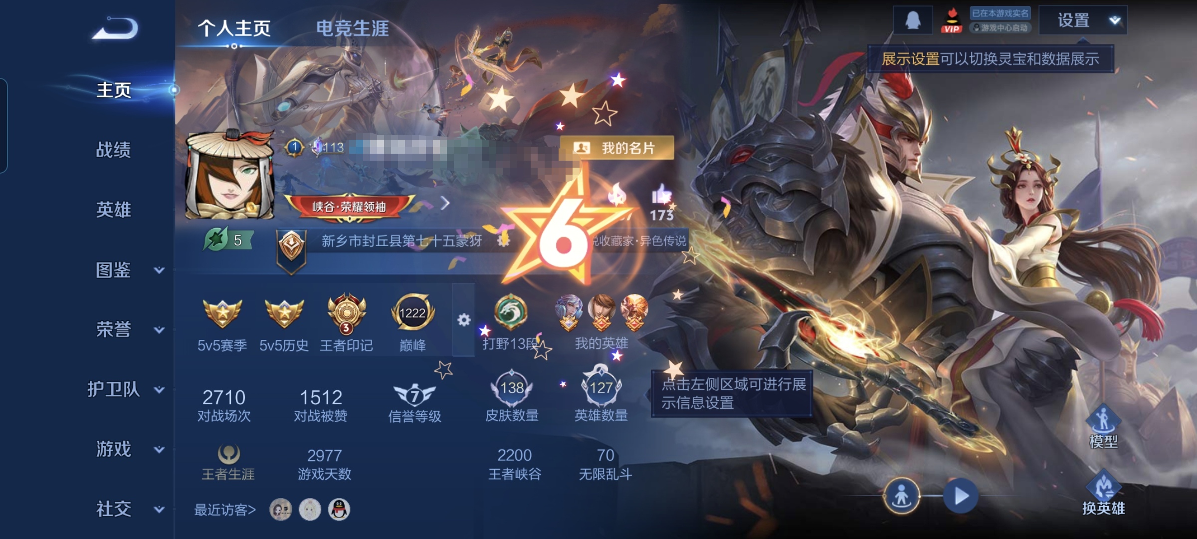 实名: 可修改 贵族等级: V5 英雄数: 127 皮肤数: 129 星传说: