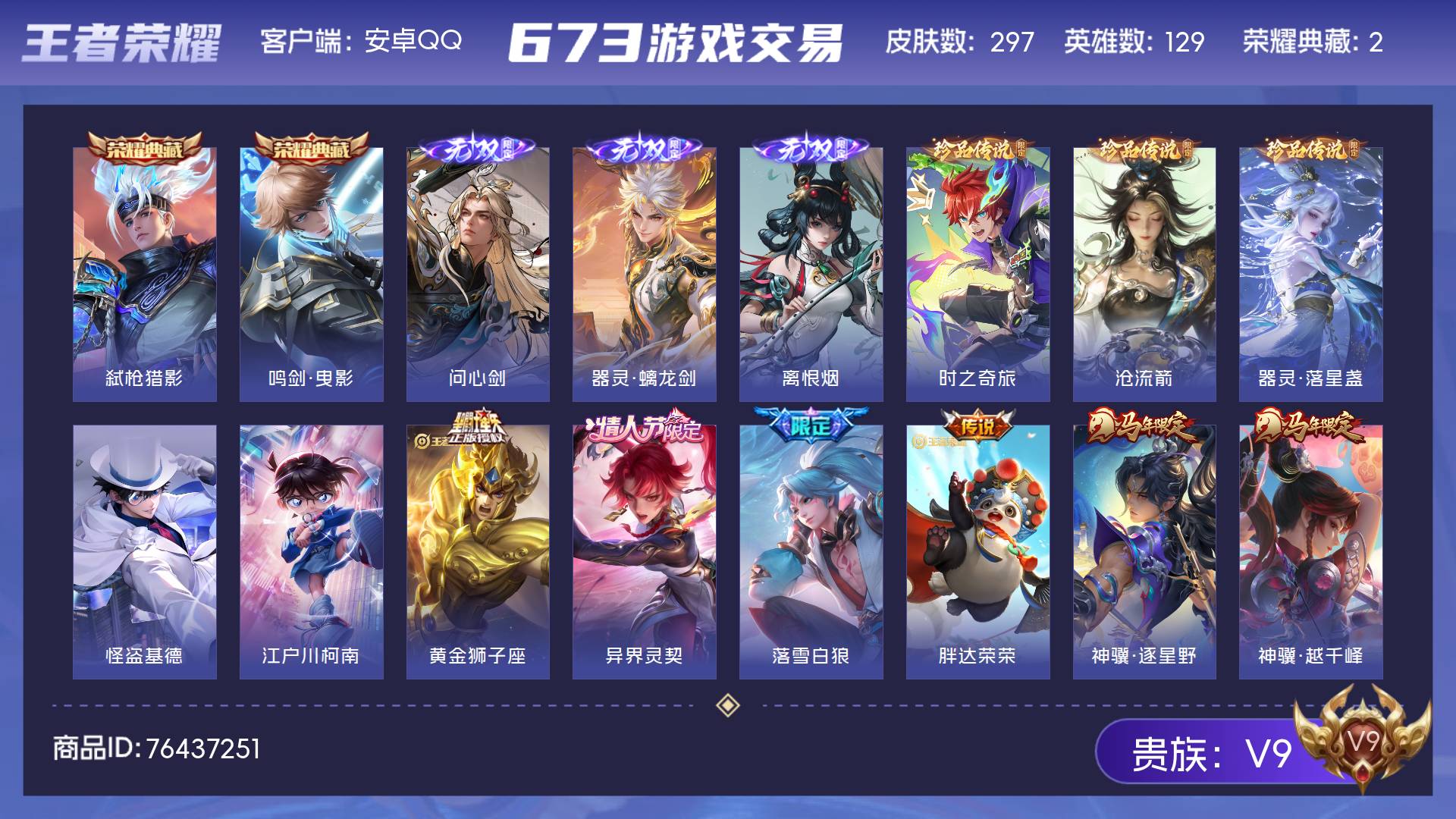 V9 皮肤297 英雄129 至尊星耀 荣耀典藏2 无双皮肤3 珍品传说5 传说41