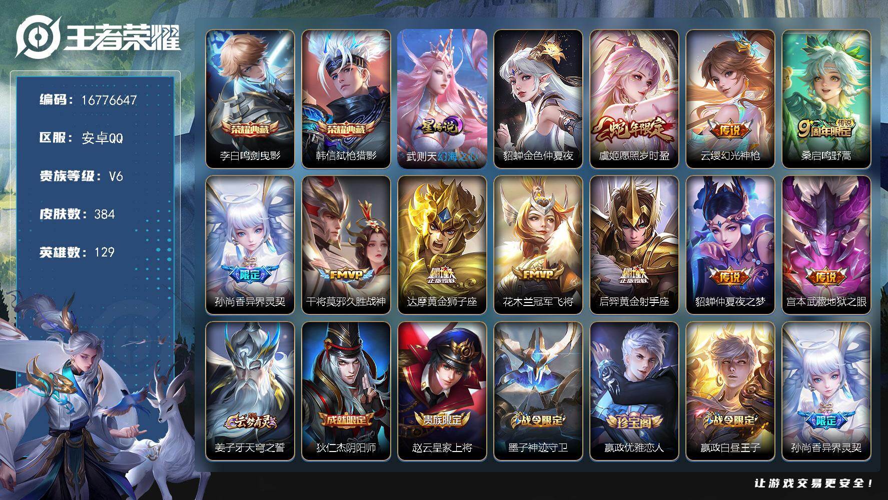 安卓QQ/至尊星耀/340皮肤/129英雄/3典藏/0珍品无双/2无双/2珍品传说/35传说/93史