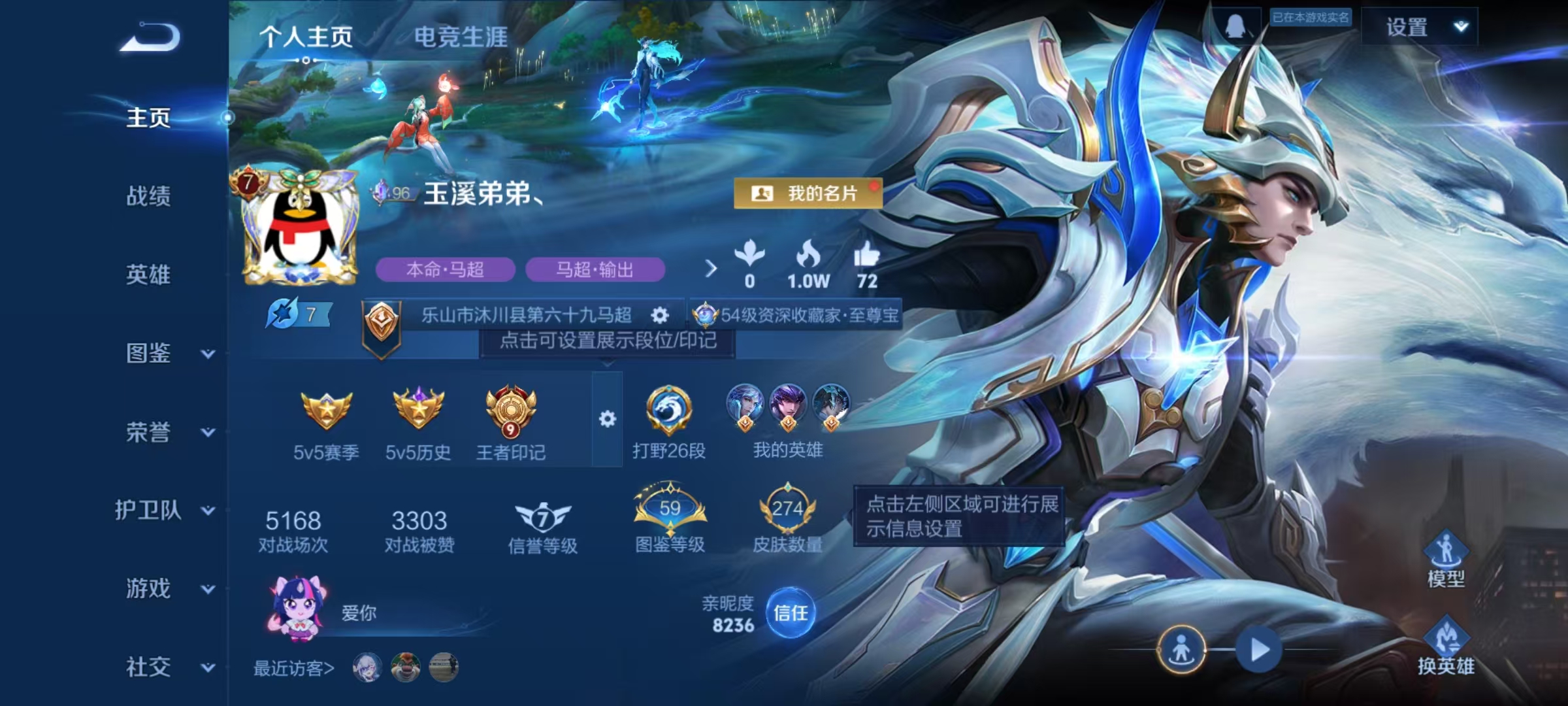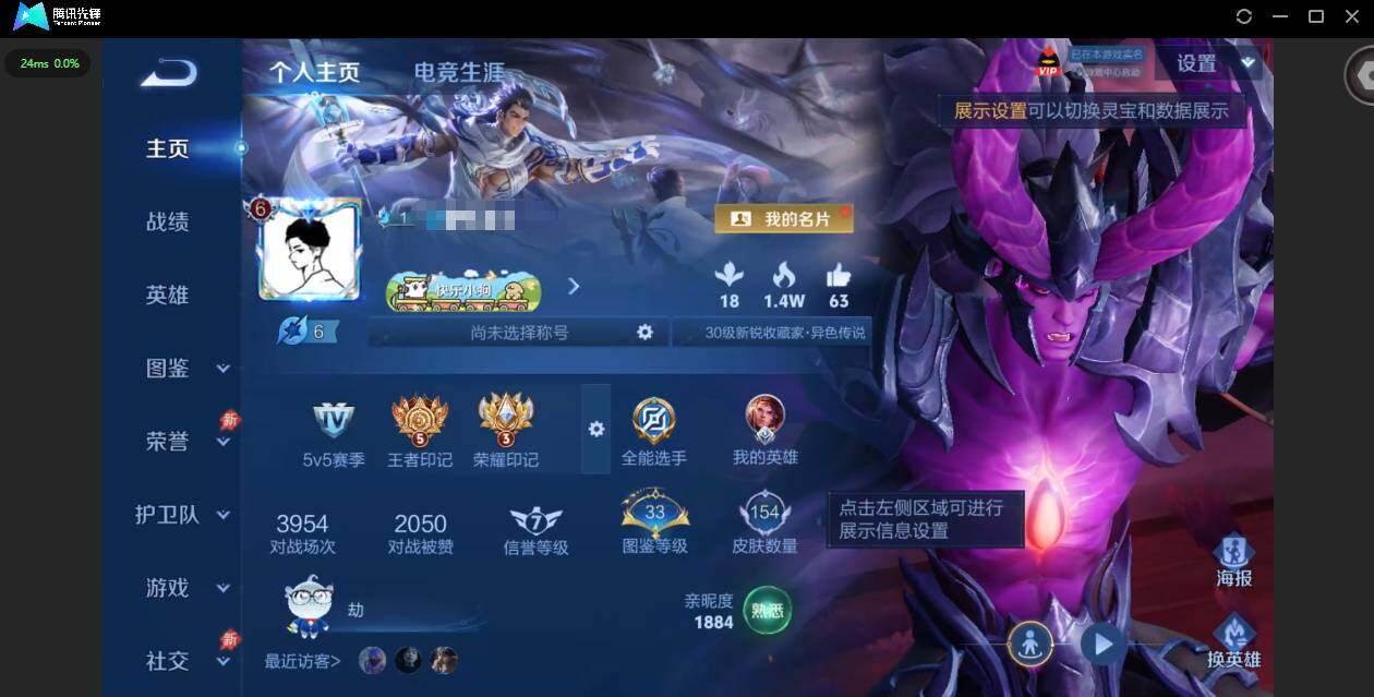 实名: 可修改 贵族等级: V6 英雄数: 126 皮肤数: 154 星传说: