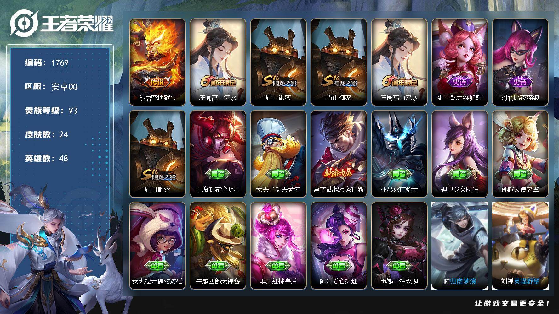 2827459 王者荣耀账号 安卓Q-V3-秩序白银III段位-48英雄-