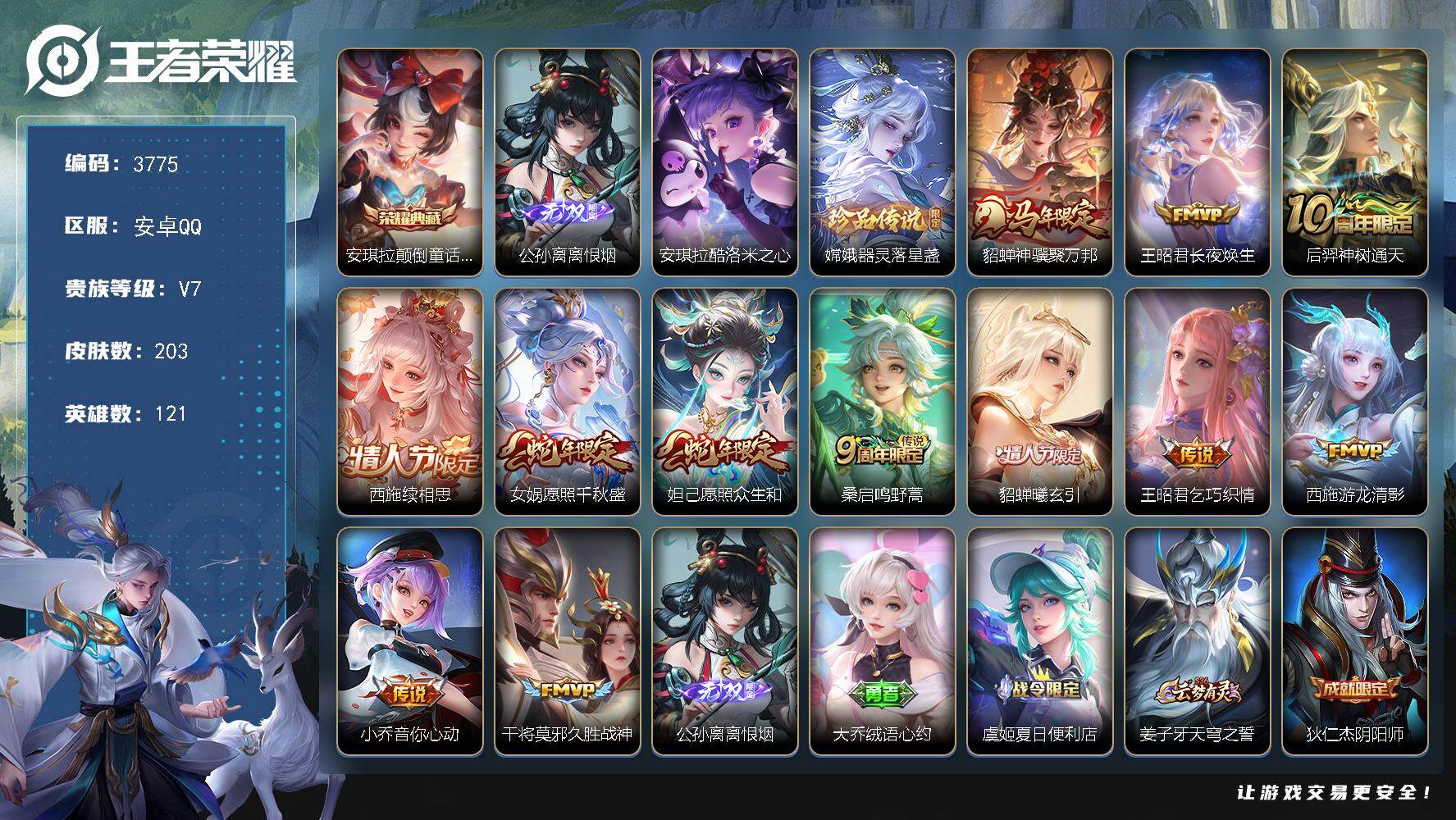 安卓QQ/至尊星耀/370皮肤/128英雄/3典藏/0珍品无双/1无双/1珍品传