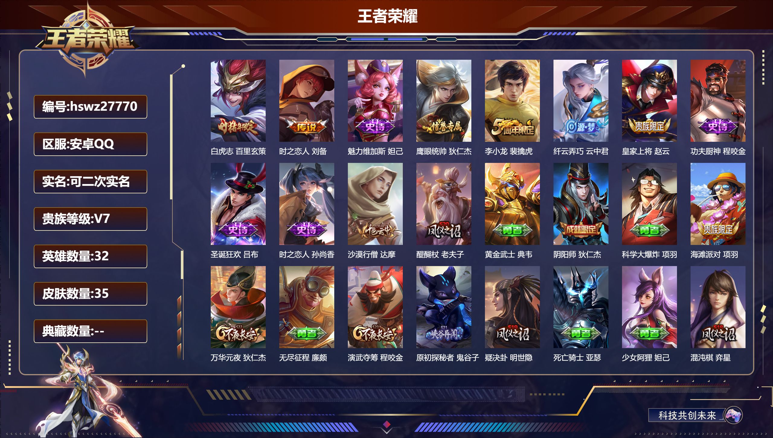 安卓QQ/至尊星耀/35皮肤/32英雄/0典藏/0珍品无双/0无双/0珍品传说/