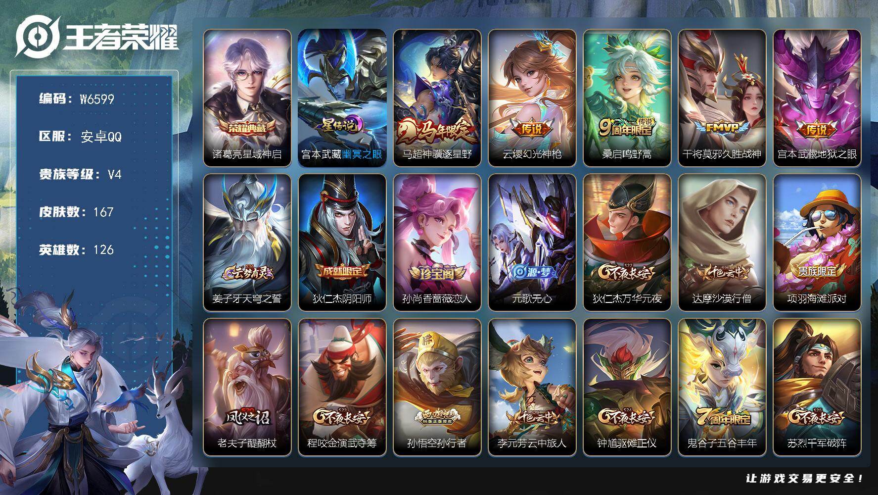 V6 1典藏 8传说 126英雄 209皮肤 可修改实名 男号