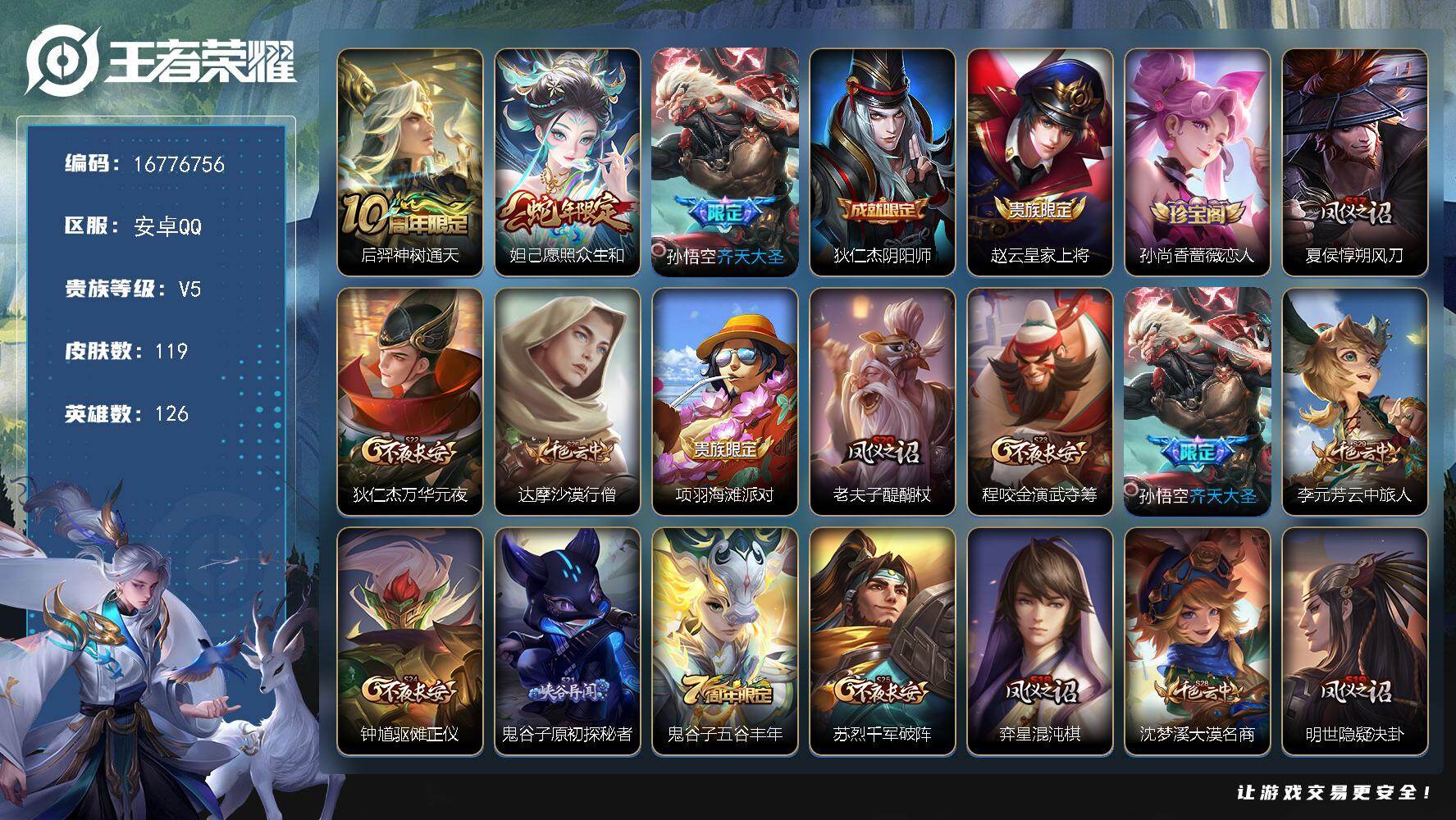 【16776756】贵族5/皮肤119/传说3/史诗24/英雄126/后羿神树