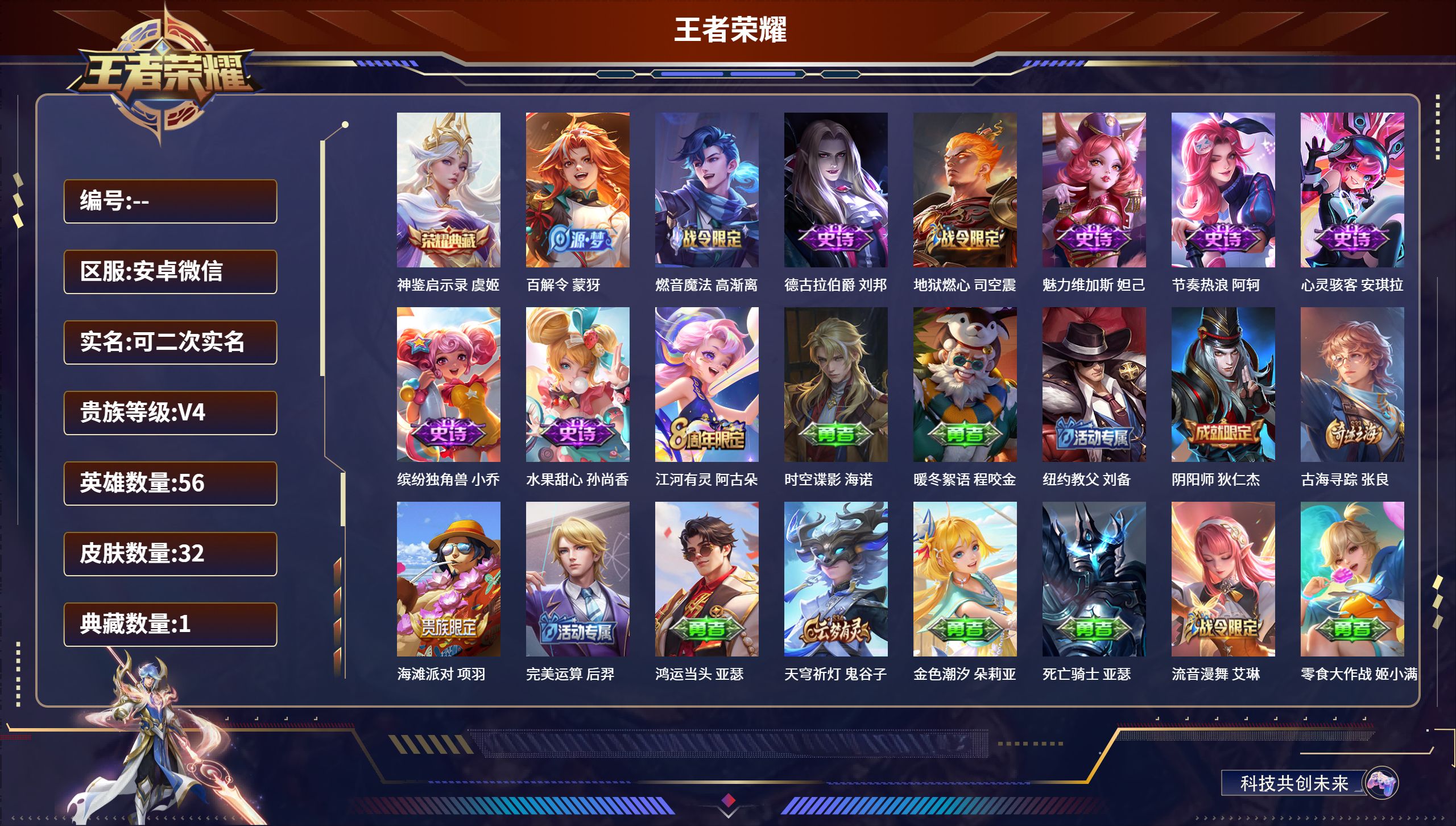 最强王者/32皮肤/56英雄/1典藏/0珍品无双/0无双/0珍品传说/0传说/10史诗/2稀有英雄